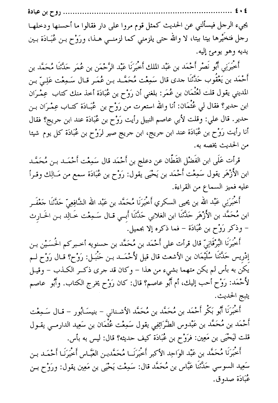 أَخْبَرَنِي أَبُو نَصْرٍ أَحْمَدُ بْنُ عَبْدِ الْمَلِكِ أخبرنا عبد الرّحمن بن عمر حدّثنا محمّد بن أحمد بن يعقوب حَدَّثَنَا جدي قَالَ سمعت مُحَمَّد بْن عُمَر قال سمعت عليّ بن المديني يقول قلت لعثمان بْن عُمَر: بلغني أن روح بْن عبادة أخذ منك كتاب عمران ابن حدير؟ فَقَالَ لي عُثْمَان: أنا وَالله استعرت من روح بْن عبادة كتاب عمران بْن حدير. قَالَ علي: وَقلت لأبي عاصم النبيل رأيت روح بْن عبادة عند ابْن جريج؟ فَقَالَ أنا رأيت روح بْن عبادة عند ابْن جريج، ابْن جريج صير لروح بْن عبادة كل يوم شيئا من الحديث يخصه به.