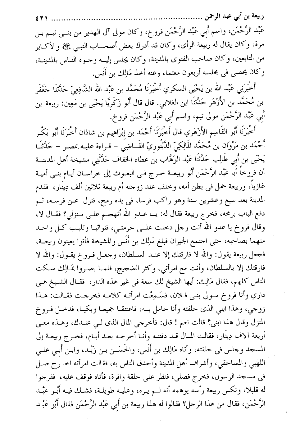 أَخْبَرَنَا أَبُو الْقَاسِم الأزهري قَالَ أَخْبَرَنَا أَحْمَد بْنُ إبراهيم بن شاذان أَخْبَرَنَا أَبُو بَكْر أَحْمَد بْن مَرْوَان بْن مُحَمَّد المالكي الدينوري الْقَاضِي- قراءة عَلَيْهِ بمصر- حدّثنا يحيى بن أبي طالب حدّثنا عبد الوهّاب بن عطاء الخفاف حدّثني مشيخة أهل المدينة أن فروخا أبا عَبْد الرَّحْمَنِ أَبُو رَبِيعَة خرج فِي البعوث إِلَى خراسان أيام بني أمية غازيا، وَربيعة حمل فِي بطن أمه، وَخلف عند زوجته أم رَبِيعَة ثلاثين ألف دينار، فقدم الْمَدِينَة بعد سبع وَعشرين سنة وَهُوَ راكب فرسا، فِي يده رمح، فنزل عَنْ فرسه، ثُمَّ دفع الباب برمحه، فخرج رَبِيعَة فَقَالَ له: يا عدو اللَّه أتهجم على منزلي؟ فَقَالَ لا، وَقَالَ فروخ يا عدو اللَّه أنت رجل دخلت على حرمتي، فتواثبا وَتلبب كل وَاحد منهما بصاحبه، حَتَّى اجتمع الجيران فبلغ مَالِك بْن أَنَس وَالمشيخة فأتوا يعينون رَبِيعَة، فجعل رَبِيعَة يقول: وَالله لا فارقتك إِلا عند السلطان، وَجعل فروخ يقول: وَالله لا فارقتك إِلا بالسلطان، وَأنت مَعَ امرأتي، وَكثر الضجيج، فلما بصروا بمالك سكت الناس كلهم، فَقَالَ مَالِك: أيها الشيخ لك سعة فِي غير هذه الدار، فَقَالَ الشيخ هي داري وَأنا فروخ مولى بني فلان، فسمعت امرأته كلامه فخرجت فقالت: هذا زوجي، وَهذا ابني الَّذِي خلفته وَأنا حامل به، فاعتنقا جميعا وَبكيا، فدخل فروخ المنزل وَقَالَ هذا ابني؟ قالت نعم! قَالَ: فأخرجي المال الَّذِي لي عندك، وَهذه معي أربعة آلاف دينار، فقالت المال قد دفنته وَأنا أخرجه بعد أيام، فخرج رَبِيعَة إِلَى المسجد وَجلس فِي حلقته، وَأتاه مَالِك بْن أَنَس، وَالحسن بْن زيد، وَابن أَبِي علي اللهبي وَالمساحقي، وَأشراف أَهْل الْمَدِينَة وَأحدق الناس به، فقالت امرأته اخرج صل فِي مسجد الرسول، فخرج فصلى، فنظر على حلقة وَافرة، فأتاه فوقف عَلَيْهِ، ففرجوا له قليلا، وَنكس رَبِيعَة رأسه يوهمه أنه لم يره، وَعليه طويلة، فشك فيه أَبُو عَبْد الرَّحْمَنِ، فَقَالَ من هذا الرجل؟ فَقَالُوا له هذا رَبِيعَة بْن أَبِي عَبْد الرَّحْمَنِ فَقَالَ أَبُو عَبْد