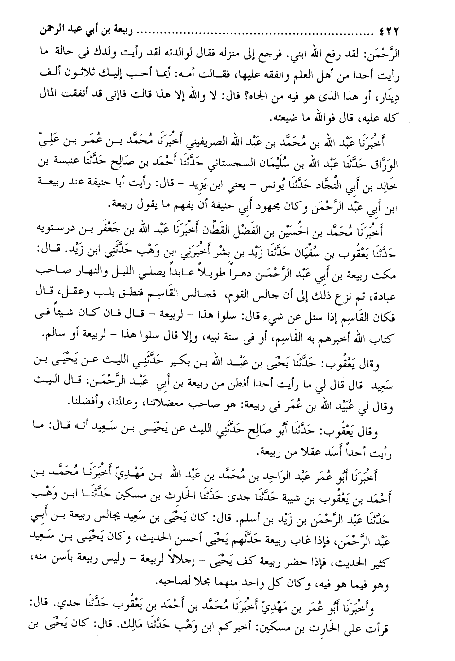 أَخْبَرَنَا عَبْدُ اللَّهِ بْنُ مُحَمَّدِ بْنِ عَبْدِ اللَّه الصريفيني أَخْبَرَنَا مُحَمَّد بْن عُمَر بْن عَلِيّ الوراق حدّثنا عبد الله بن سليمان السجستاني حدّثنا أحمد بن صالح حَدَّثَنَا عنبسة بْن خَالِد بْن أَبِي النجاد حَدَّثَنَا يونس- يعني ابْن يَزِيد- قَالَ: رأيت أبا حنيفة عند ربيعة ابن أَبِي عَبْد الرَّحْمَنِ وَكَانَ مجهود أَبِي حنيفة أن يفهم ما يقول رَبِيعَة.