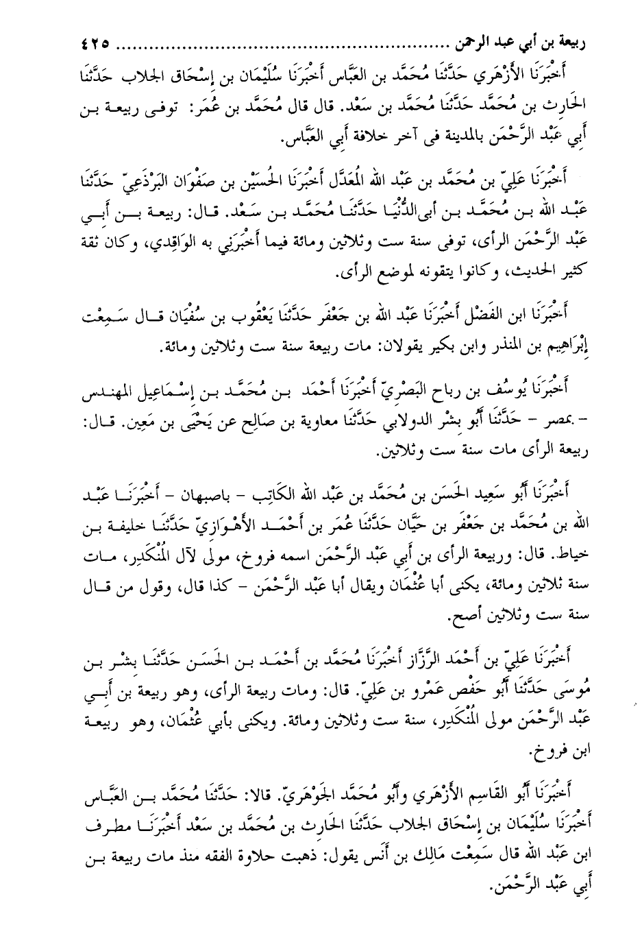 أَخْبَرَنَا أَبُو سَعِيد الْحَسَن بْن مُحَمَّدِ بن عبد الله الكاتب- بأصبهان- أخبرنا عَبْدُ اللَّهِ بْنُ مُحَمَّدِ بْنِ جَعْفَرِ بْنِ حيّان حدّثنا عمر بن أحمد الأهوازيّ حَدَّثَنَا خليفة بْن خياط. قَالَ: وَربيعة الرأي بْن أَبِي عَبْد الرَّحْمَنِ اسمه فروخ، مولى لآل المنكدر، مات سنة ثلاثين وَمائة، يكنى أبا عُثْمَان وَيقال أبا عَبْد الرَّحْمَنِ- كذا قَالَ، وَقول من قَالَ سنة ست وَثلاثين أصح.