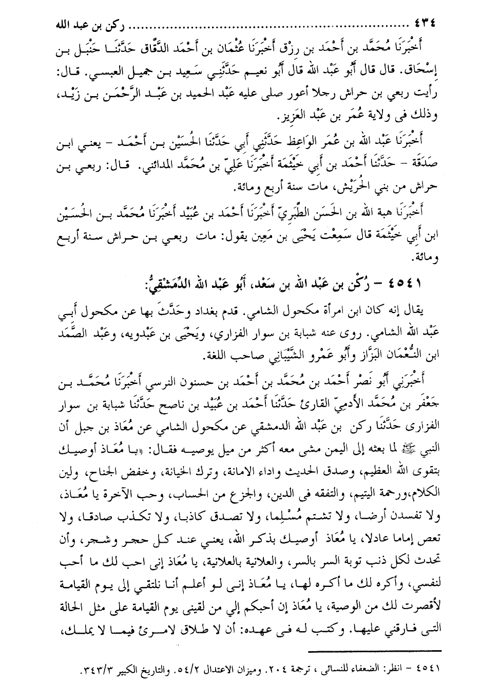 أَخْبَرَنِي أَبُو نَصْرٍ أَحْمَدُ بْنُ مُحَمَّدِ بْنِ أَحْمَدَ بْنِ حَسْنُونَ النرسي أَخْبَرَنَا مُحَمَّدُ بْنُ جَعْفَرِ بْنِ مُحَمَّدٍ الأَدَمِيُّ القارئ حدّثنا أحمد بن عبيد بن ناصح حدّثنا شبابة بن سوار الفزاري حَدَّثَنَا رُكْنُ بْنُ عَبْدِ اللَّهِ الدِّمَشْقِيُّ عَنْ مَكْحُولٍ الشَّامِيِّ عَنْ مُعَاذِ بْنِ جَبَلٍ أَنَّ النَّبِيَّ صَلَّى اللَّهُ عَلَيْهِ وَسَلَّمَ لَمَّا بَعَثَهُ إِلَى الْيَمَنِ مَشَى مَعَهُ أَكْثَرُ مِنْ مِيلٍ يُوصِيهِ فَقَالَ: «يَا مُعَاذُ أُوصِيكَ بِتَقْوَى اللَّهِ الْعَظِيمِ، وَصِدْقِ الْحَدِيثِ وَأَدَاءِ الأَمَانَةِ، وَتَرْكِ الْخِيَانَةِ، وَخَفْضِ الْجَنَاحِ، وَلِينِ الْكَلامِ، وَرَحْمَةِ الْيَتِيمِ، وَالتَّفَقُّهِ فِي الدِّينِ، وَالْجَزَعِ مِنَ الْحِسَابِ، وَحُبِّ الآخِرَةِ يَا مُعَاذُ، وَلا تُفْسِدَنَّ أَرْضًا، وَلا تَشْتُمْ مُسْلِمًا، وَلا تُصَدِّقْ كَاذِبًا، وَلا تُكَذِّبْ صَادِقًا، وَلا تَعْصِ إِمَامًا عَادِلا، يَا مُعَاذُ أُوصِيكَ بِذِكْرِ اللَّهِ، يَعْنِي عِنْدَ كُلِّ حَجَرٍ وَشَجَرٍ، وَأَنْ تُحْدِثَ لِكُلِّ ذَنْبٍ تَوْبَةً السَّرُّ بِالسِّرِّ، وَالْعَلانِيَةُ بِالْعَلانِيَةِ، يَا مُعَاذُ إِنِّي أُحِبُّ لَكَ مَا أُحِبُّ لِنَفْسِي، وَأَكْرَهُ لَكَ مَا أَكْرَهُ لَهَا، يَا مُعَاذُ إِنِّي لَوْ أَعْلَمُ أَنَّا نَلْتَقِي إِلَى يَوْمِ الْقِيَامَةِ لأَقْصَرْتُ لَكَ مِنَ الْوَصِيَّةِ، يَا مُعَاذُ إِنَّ أَحَبَّكُمْ إِلَيَّ مَنْ لَقِيَنِي يَوْمَ الْقِيَامَةِ عَلَى مِثْلِ الْحَالَةِ الَّتِي فَارَقَنِي عَلَيْهَا. وَكَتَبَ لَهُ فِي عَهْدِهِ: أَنْ لا طَلاقَ لامْرِئٍ فيما لا يملك،