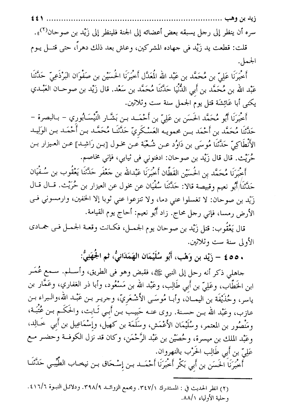 أخبرنا محمّد بن الحسين القطّان أَخْبَرَنَا عَبْدُ اللَّهِ بْنُ جَعْفَرٍ حَدَّثَنَا يعقوب بن سفيان حَدَّثَنَا أَبُو نعيم وَقبيصة قالا: حَدَّثَنَا سفيان عَنْ مخول عَنِ العيزار بْن حريث. قَالَ قَالَ زيد بْن صوحان: لا تغسلوا عني دما، وَلا تنزعوا عني ثوبا إِلا الخفين، وَارمسوني فِي الأرض رمسا، فإني رجل محاج. زاد أَبُو نعيم: أحاج يوم القيامة.