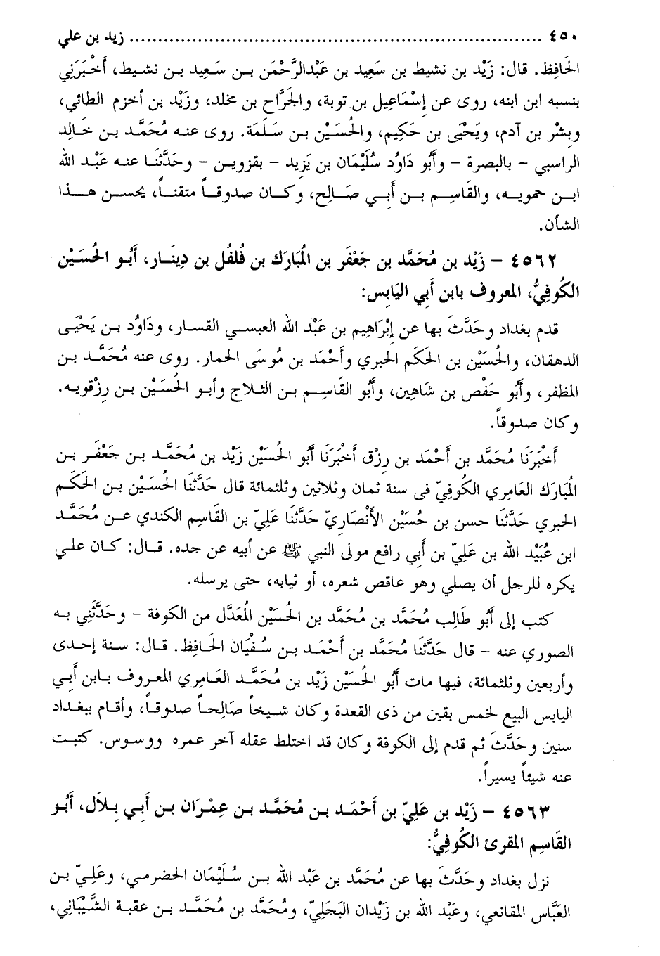 4563- زيد بْن عَلِيّ بْن أَحْمَد بْن مُحَمَّد بْن عمران بْن أَبِي بلال، أَبُو الْقَاسِم المقرئ الكوفي: