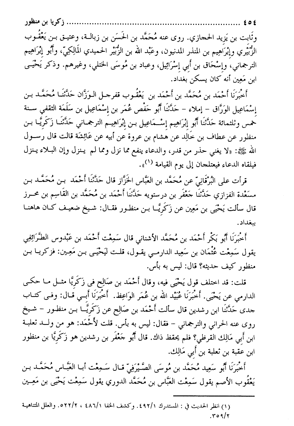 أَخْبَرَنَا أَبُو بَكْر أَحْمَد بْن مُحَمَّد الأشناني قال سمعت أحمد بن عبدوس الطرائفي يقول سمعت عثمان بن سعيد الدارمي يقول، قلت ليحيى بن معين: فزكريا بْن منظور كيف حديثه؟ قَالَ: ليس به بأس.