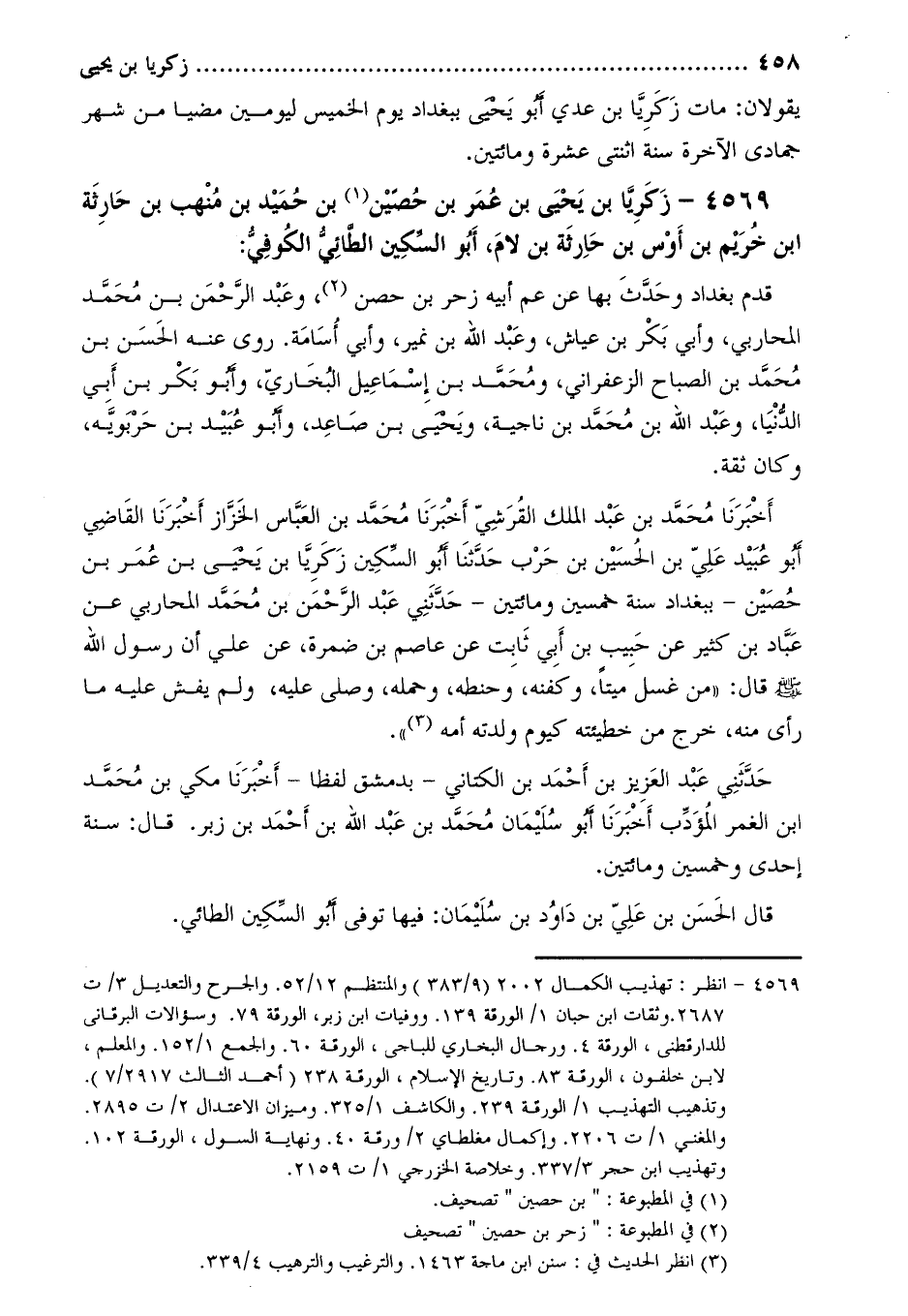 4569-[1] زَكَرِيَّا بن يحيى بن عمر بن حصين [2] بن حميد بن منهب بن حارثة ابن خريم بْن أوس بْن حارثة بْن لام، أَبُو السكين الطائي الكوفي: