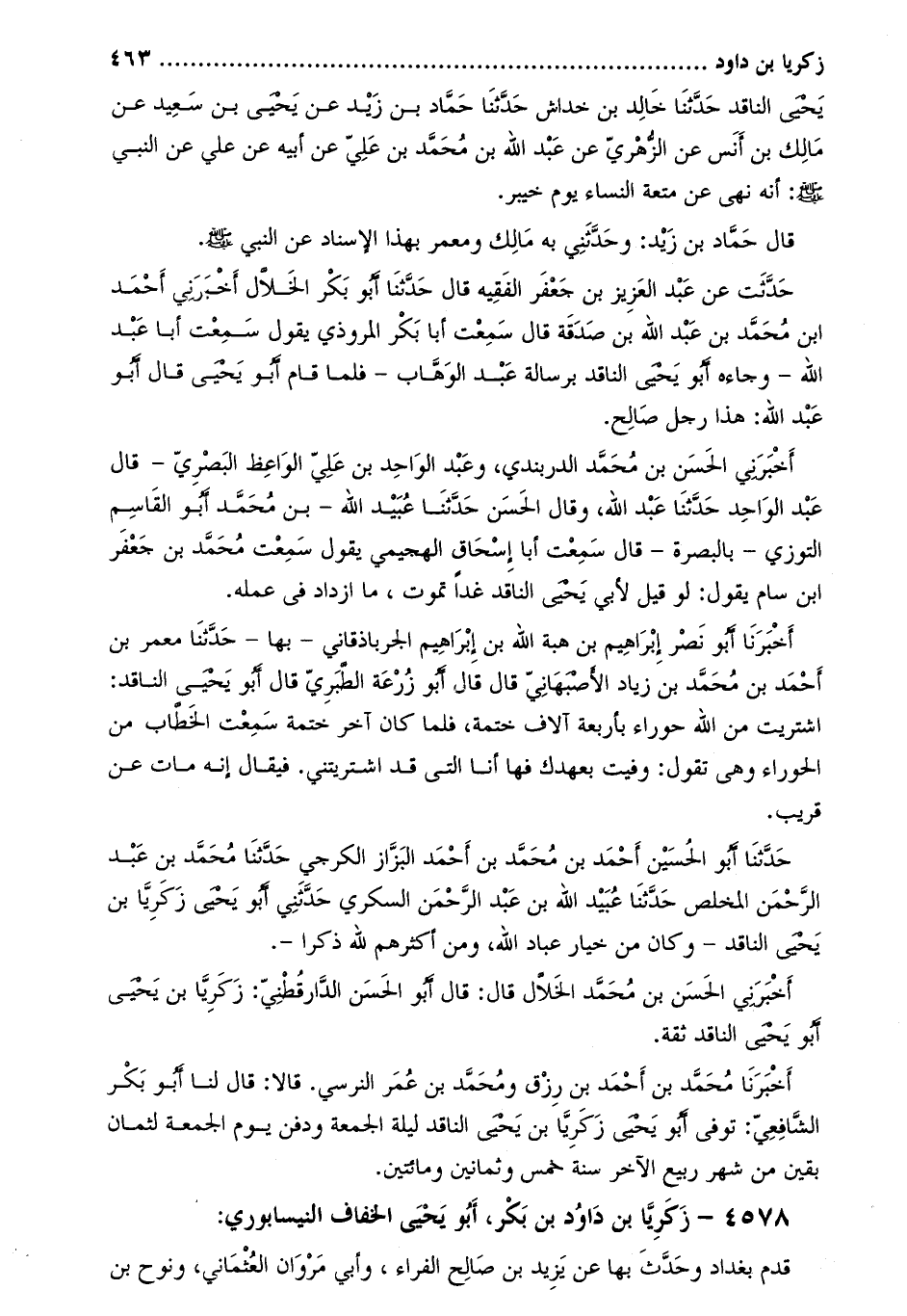 حَدَّثَنَا أَبُو الْحُسَيْنِ أَحْمَدُ بْنُ مُحَمَّدِ بْنِ أَحْمَدَ البزاز الكرجي حدّثنا محمّد بن عبد الرّحمن المخلص حدثنا عبيد الله بن عبد الرحمن السكري حَدَّثَنِي أَبُو يَحْيَى زَكَرِيَّا بْن يَحْيَى الناقد- وَكَانَ من خيار عباد اللَّه، وَمن أكثرهم لله ذكرا-.