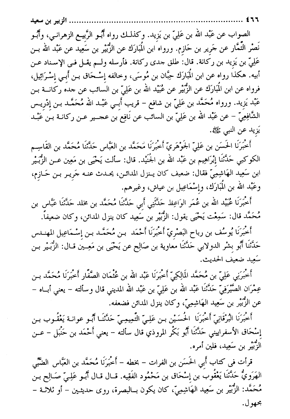أخبرني عليّ بن محمّد المالكيّ أخبرنا عبد اللَّه بْن عُثْمَان الصفار أَخْبَرَنَا مُحَمَّدُ بْنُ عمران الصّيرفيّ حدثنا عَبْد اللَّه بْن عليّ بْن عَبْد اللَّه المَدينِي قَالَ وَسألته- يعني أباه- عَنِ الزبير بْن سَعِيد الهاشمي، وَكَانَ ينزل المدائن فضعفه.