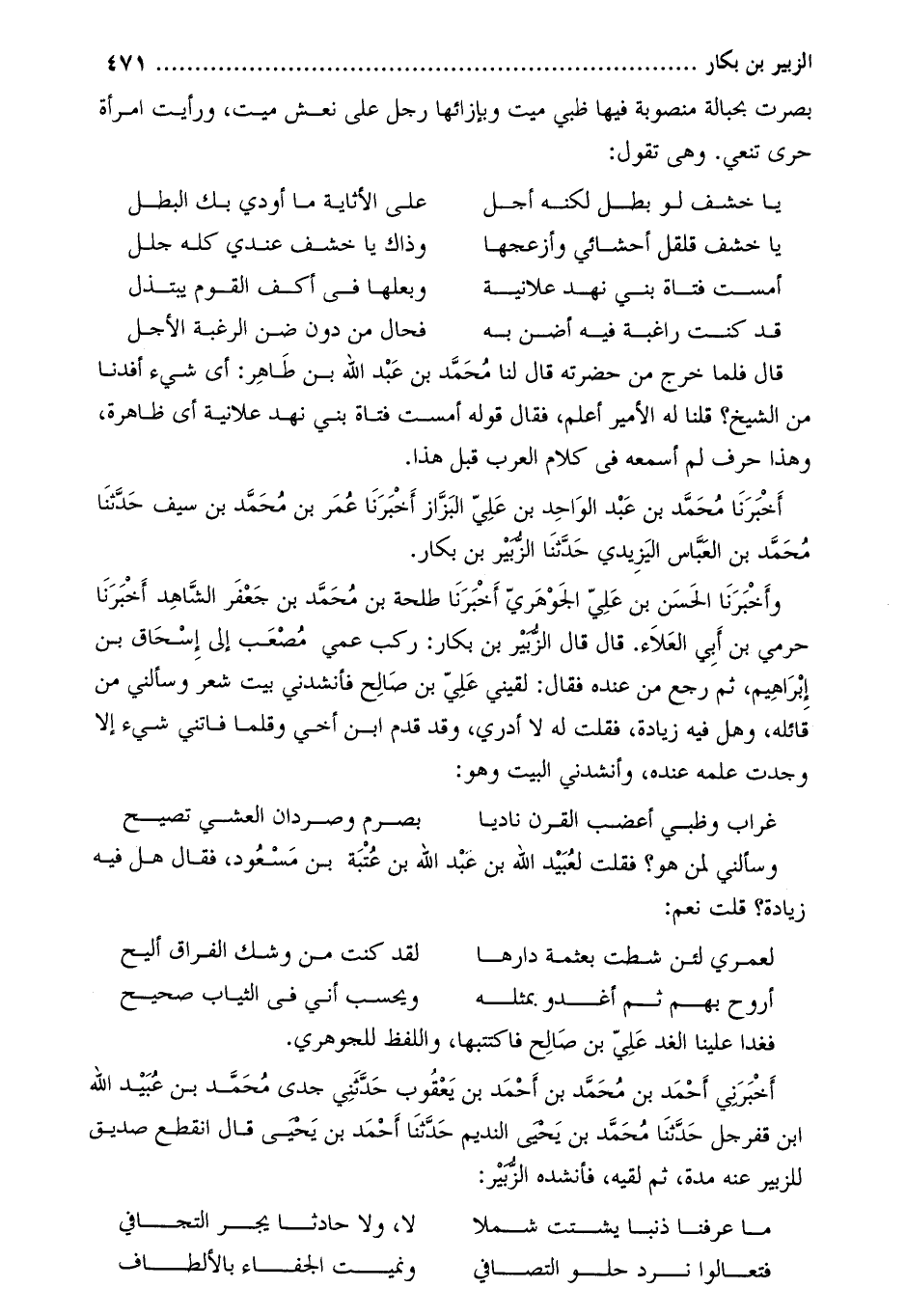أَخْبَرَنِي أَحْمَد بْن مُحَمَّد بْن أَحْمَد بن يعقوب حدّثني جدي محمّد بن عبيد الله ابن قفرجل حدّثنا محمّد بن يحيى النديم حَدَّثَنَا أَحْمَد بْن يَحْيَى قَالَ انقطع صديق للزبير عنه مدة، ثُمَّ لقيه، فأنشده الزبير: