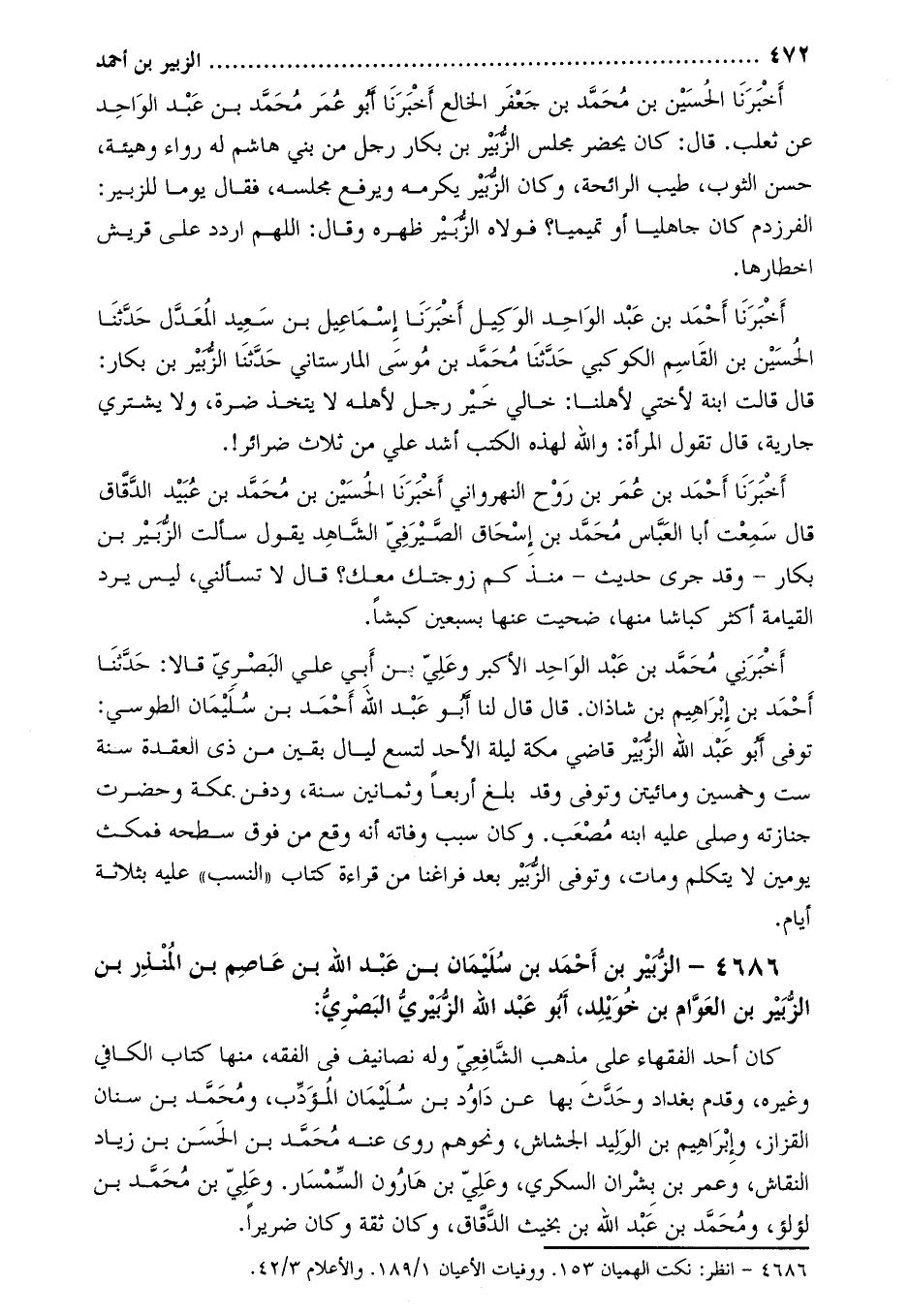 4686- الزبير بْن أَحْمَد بْن سُلَيْمَان بْن عَبْد اللَّهِ بْن عاصم بْن المنذر بْن الزبير بْن العوام بْن خويلد، أَبُو عَبْد اللَّهِ الزبيري البصري [1] :