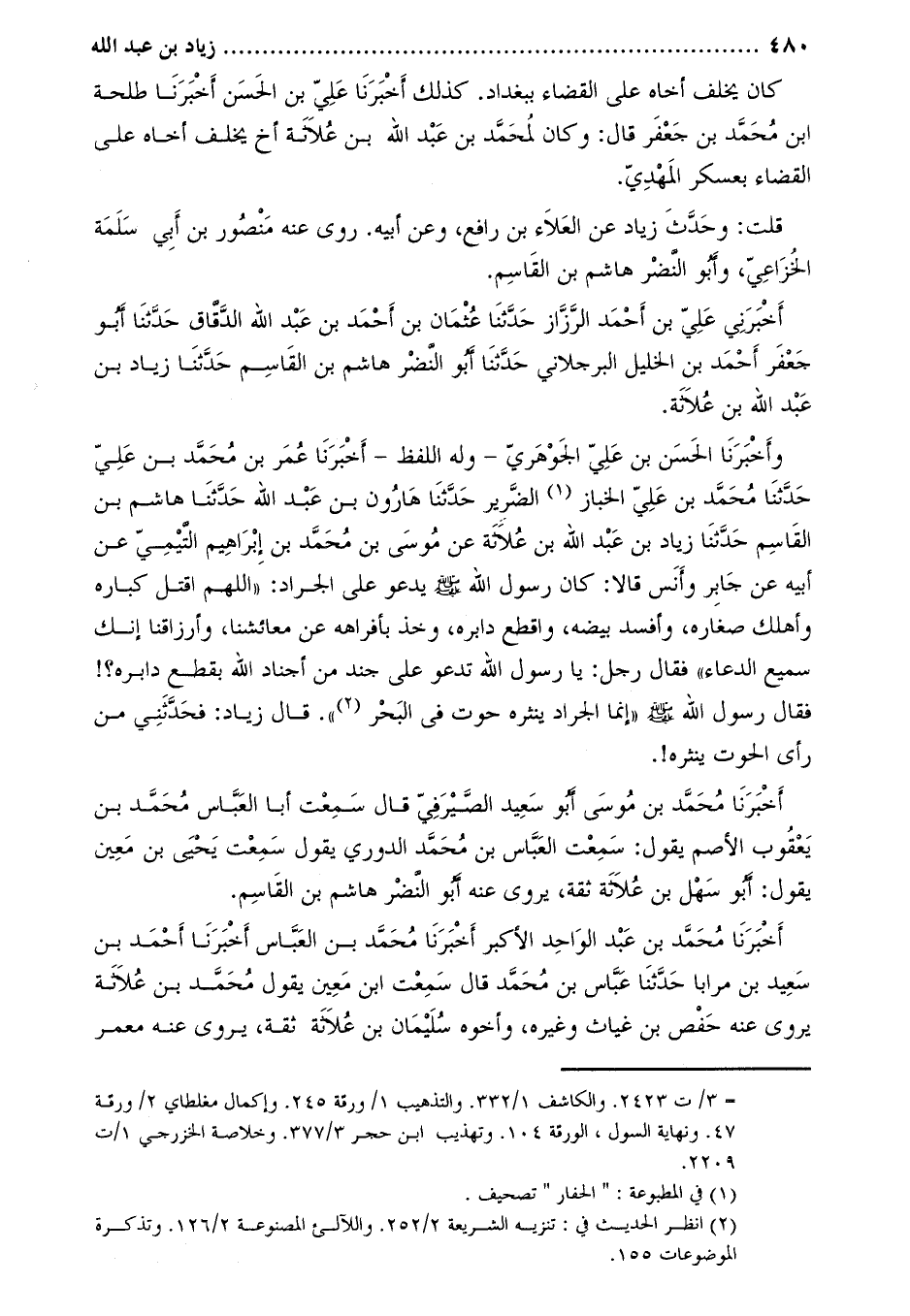 أَخْبَرَنِي عَلِيُّ بْنُ أحمد الرّزّاز حَدَّثَنَا عُثْمَانُ بْنُ أَحْمَدَ بْنِ عَبْدِ اللَّهِ الدقاق حَدَّثَنَا أَبُو جَعْفَرٍ أَحْمَدُ بْنُ الْخَلِيلِ الْبَرْجِلانِيُّ حدّثنا أبو النّضر هاشم بن القاسم حَدَّثَنَا زِيَادُ بْنُ عَبْدِ اللَّهِ بْنِ عُلاثَةَ.