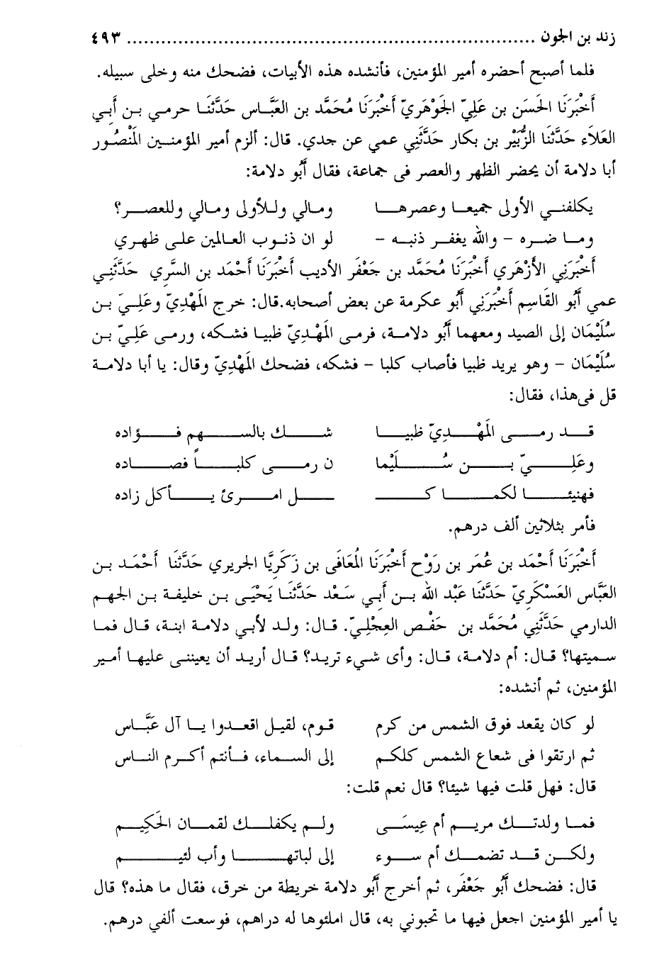 أَخْبَرَنَا أَحْمَد بْن عُمَر بن روح أخبرنا المعافى بن زكريّا الجريري حدّثنا أحمد بن العبّاس العسكري حدّثنا عبد الله بن أبي سعد حَدَّثَنَا يَحْيَى بْن خليفة بْن الجهم الدارمي حَدَّثَنِي مُحَمَّد بْن حفص العجلي. قَالَ: وَلد لأبي دلامة ابنة، قَالَ فما سميتها؟ قَالَ: أم دلامة، قَالَ: وَأي شيء تريد؟ قَالَ أريد أن يعينني عليها أمير المؤمنين، ثُمَّ أنشده: