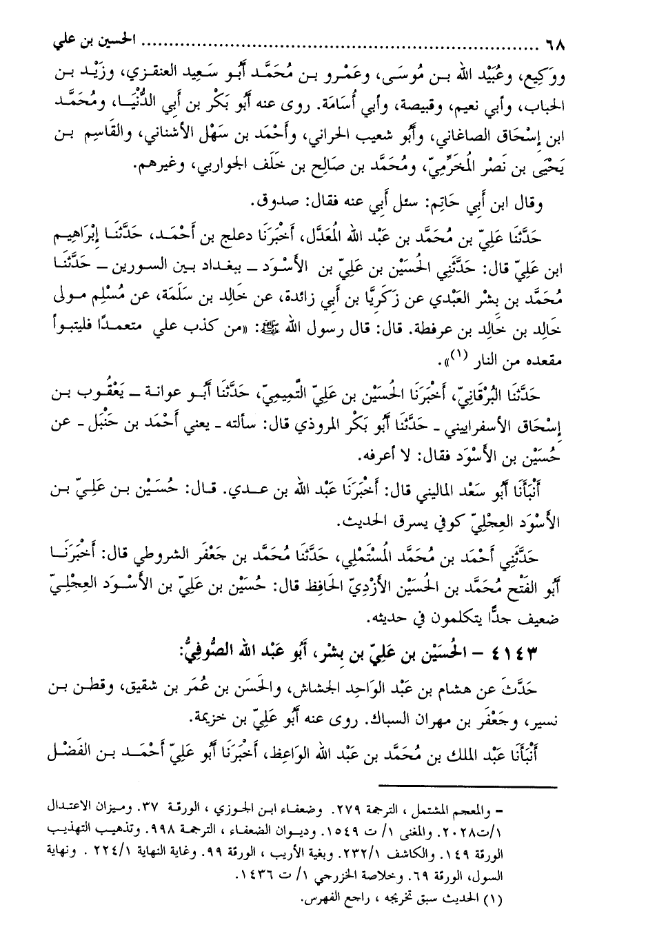 حَدَّثَنَا عَلِيُّ بْنُ مُحَمَّدِ بْنِ عَبْدِ اللَّهِ المعدل، أخبرنا دعلج بن أحمد، حدّثنا إبراهيم ابن عليّ قال: حدّثني الْحُسَيْنُ بْنُ عَلِيِّ بْنِ الأَسْوَدِ- بِبَغْدَادَ بَيْنَ السورين- حَدَّثَنَا مُحَمَّدُ بْنُ بِشْرٍ الْعَبْدِيُّ عَنْ زَكَرِيَّا بْنِ أَبِي زَائِدَةَ، عَنْ خَالِدِ بْنِ سَلَمَةَ، عن مسلم مولى خالد بن خَالِدِ بْنِ عَرْفَطَةَ. قَالَ: قَالَ رَسُولُ اللَّهِ صَلَّى اللَّهُ عَلَيْهِ وَسَلَّمَ: «مَنْ كَذَبَ عَلَيَّ مُتَعَمِّدًا فَلْيَتَبَوَّأْ مَقْعَدَهُ مِنَ النَّارِ [1] »