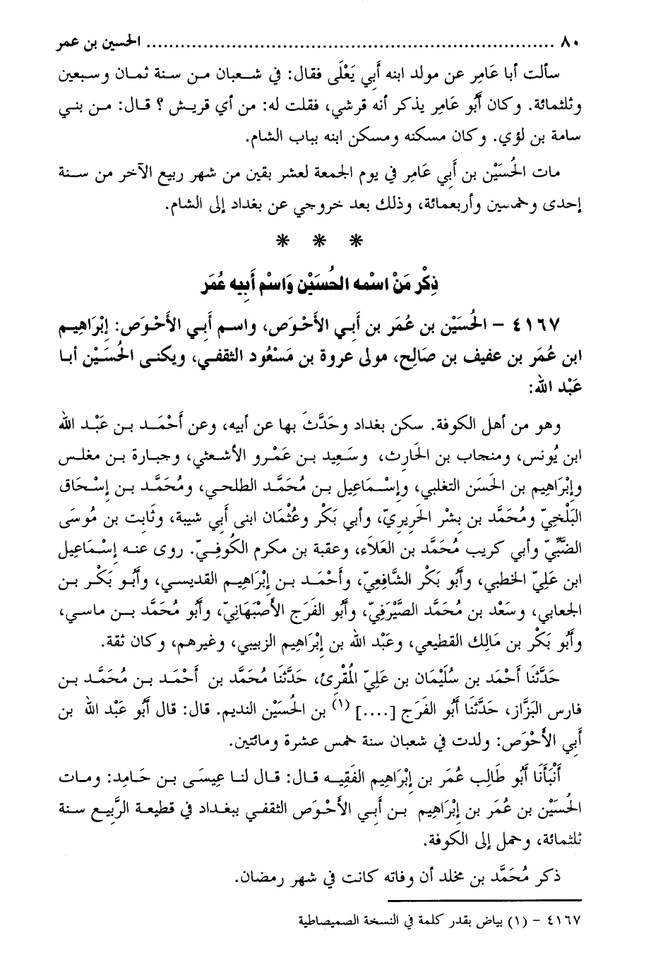 4167- الْحُسَيْن بْن عُمَرَ بن أَبِي الأحوص، واسم أبي الأحوص: إبراهيم ابن عُمَرَ بن عفيف بن صالح، مولى عروة بن مسعود الثقفي، ويكنى الْحُسَيْن أبا عَبْد اللَّهِ: