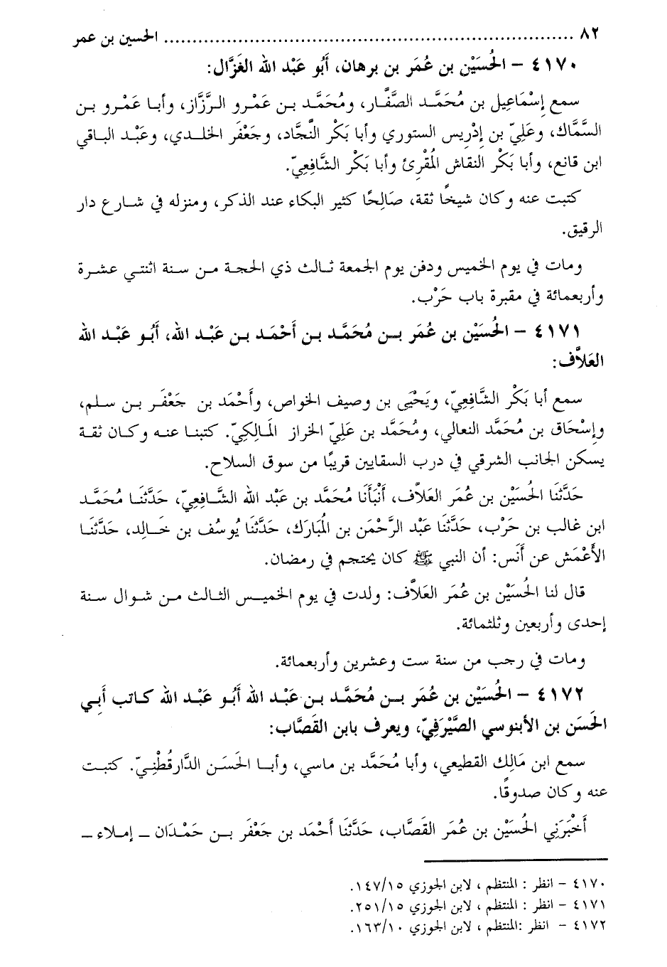 4172- الْحُسَيْن بْن عُمَرَ بْنِ مُحَمَّدِ بْنِ عَبْد اللَّهِ أَبُو عَبْدِ اللَّهِ كاتب أَبِي الْحَسَن بن الأبنوسي الصيرفي، ويعرف بابن القصاب [3] :