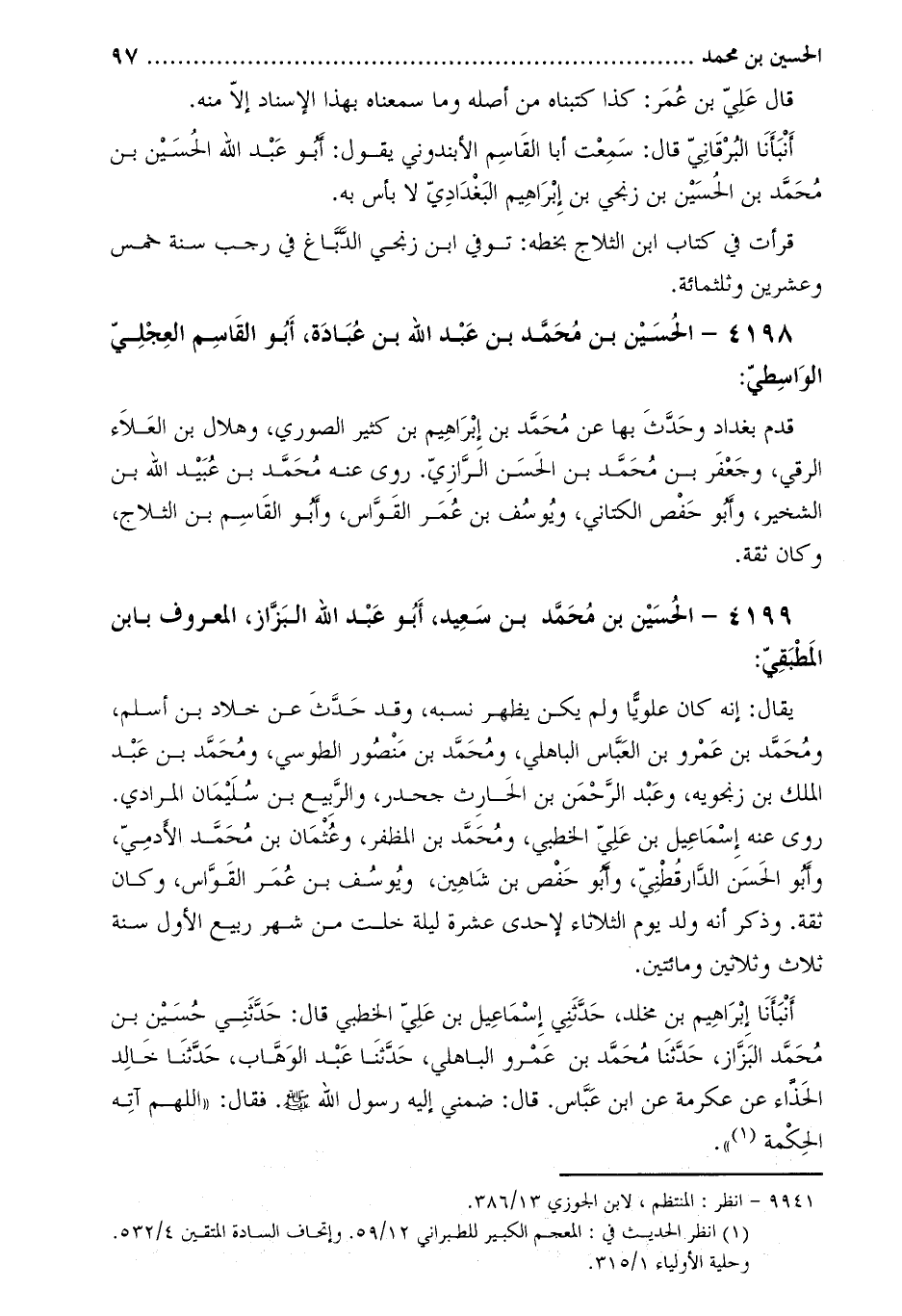 4199- الْحُسَيْن بن مُحَمَّدِ بْنِ سعيد، أَبُو عَبْدِ اللَّهِ الْبَزَّاز، المعروف بابن المطبقي [1] :