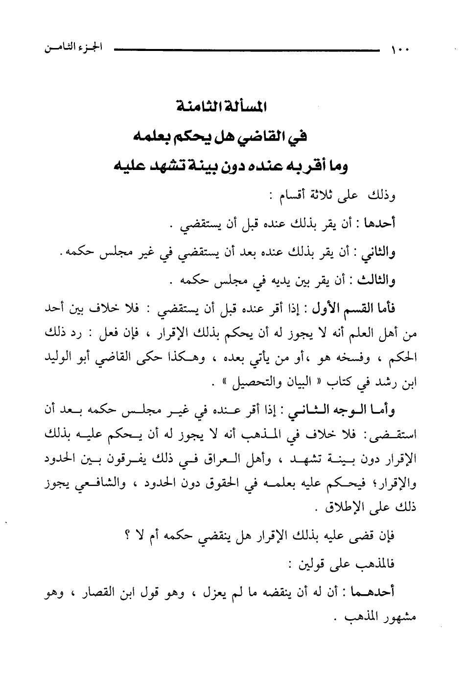 المسألة الثامنة في القاضي هل يحكم بعلمه وما أقر به عنده دون بينة تشهد عليه