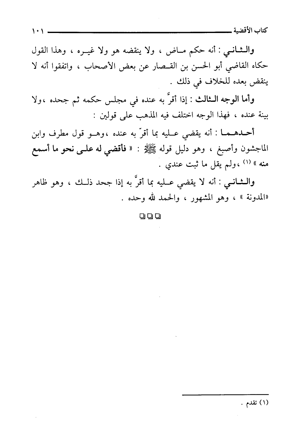 والثاني: أنه لا يقضي عليه بما أقرَّ به إذا جحد ذلك، وهو ظاهر "المدونة"، وهو المشهور، والحمد لله وحده.