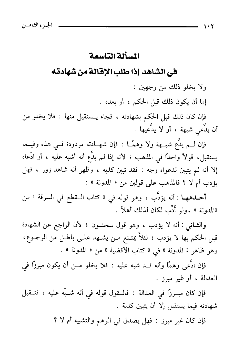 المسألة التاسعة في الشاهد إذا طلب الإقالة من شهادته