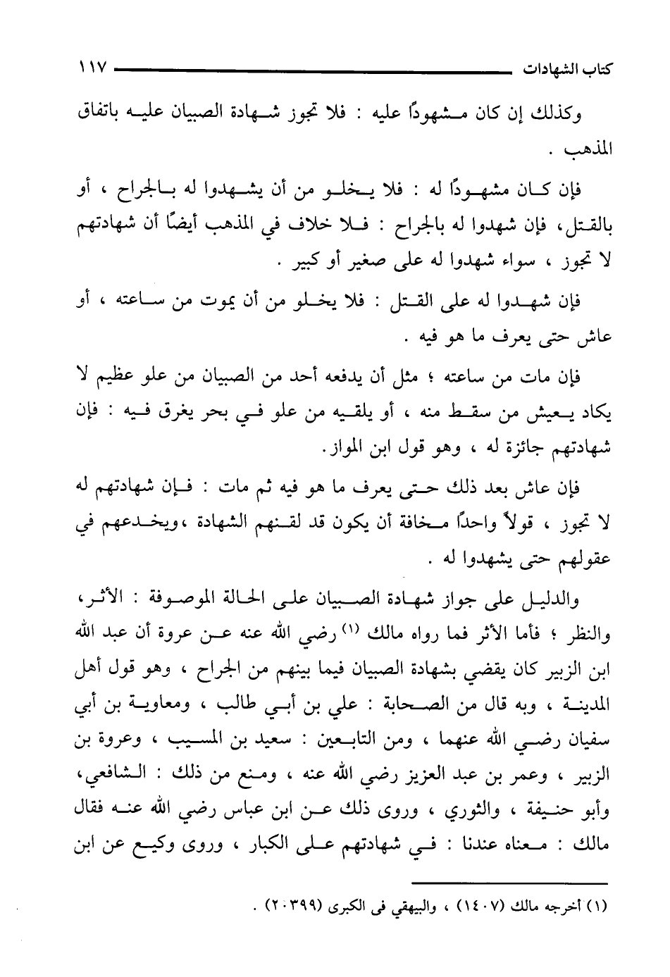 والدليل على جواز شهادة الصبيان على الحالة الموصوفة: الأثر، والنظر؛ فأما الأثر فما رواه مالك (¬1) رضي الله عنه عن عروة أن عبد الله بن الزبير كان يقضي بشهادة الصبيان فيما بينهم من الجراح، وهو قول أهل المدينة، وبه قال من الصحابة: علي بن أبي طالب، ومعاوية بن أبي سفيان رضي الله عنهما، ومن التابعين: سعيد بن المسيب، وعروة بن الزبير، وعمر بن عبد العزيز رضي الله عنه، ومنع من ذلك: الشافعي، وأبو حنيفة، والثوري، وروى ذلك عن ابن عباس رضي الله عنه فقال مالك: معناه عندنا: في شهادتهم على الكبار، وروى وكيع عن ابن