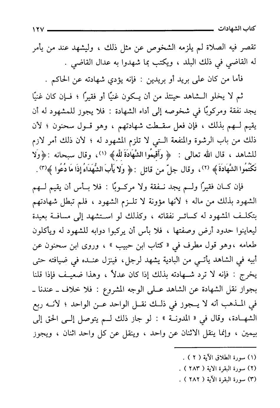 ثم لا يخلو الشاهد حينئذ من أن يكون غنيًا أو فقيرًا؛ فإن كان غنيًا يجد نفقة ومركوبًا في شخوصه إلى أداء الشهادة: فلا يجوز للمشهود له أن يقيم لهم بذلك، فإن فعل سقطت شهادتهم، وهو قول سحنون؛ لأن ذلك من باب الرشوة والمنفعة التي لا تلزم المشهود له؛ لأن ذلك أمر لازم للشاهد، قال الله تعالى: {وَأَقِيمُوا الشَّهَادَةَ لِلَّهِ} (¬1)، وقال سبحانه: {وَلَا تَكْتُمُوا الشَّهَادَةَ} (¬2)، وقال جلّ من قائل: {وَلَا يَأْبَ الشُّهَدَاءُ إِذَا مَا دُعُوا} (¬3).