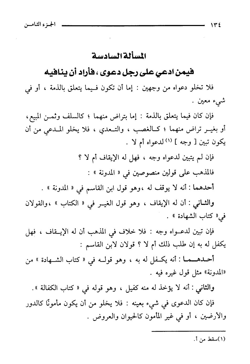 المسألة السادسة فيمن ادعي على رجل دعوى، فأراد أن ينافيه