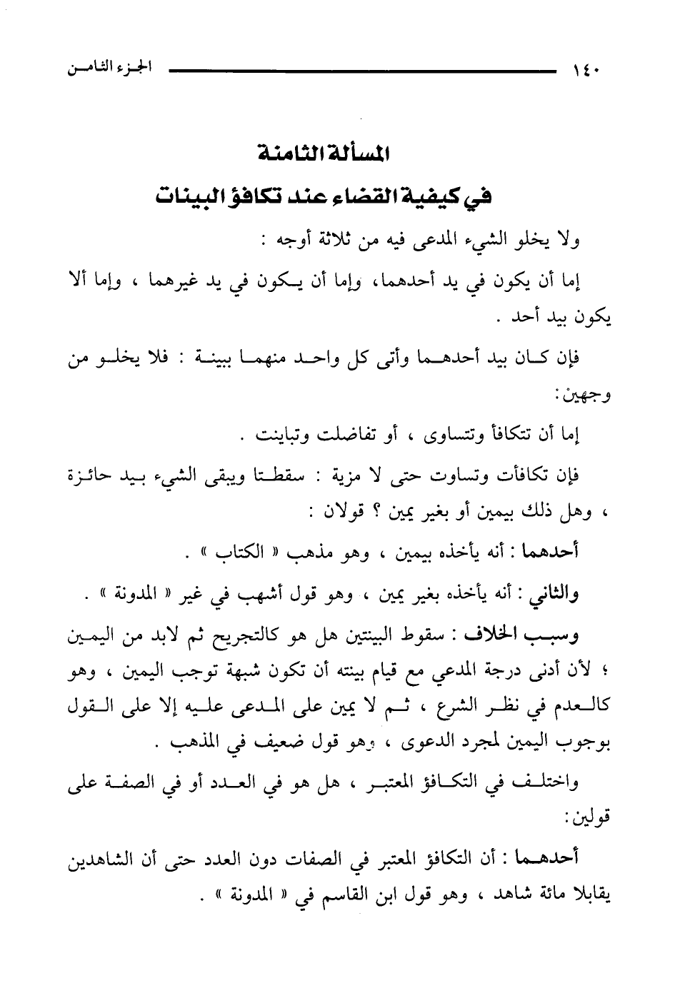 المسألة الثامنة في كيفية القضاء عند تكافؤ البينات
