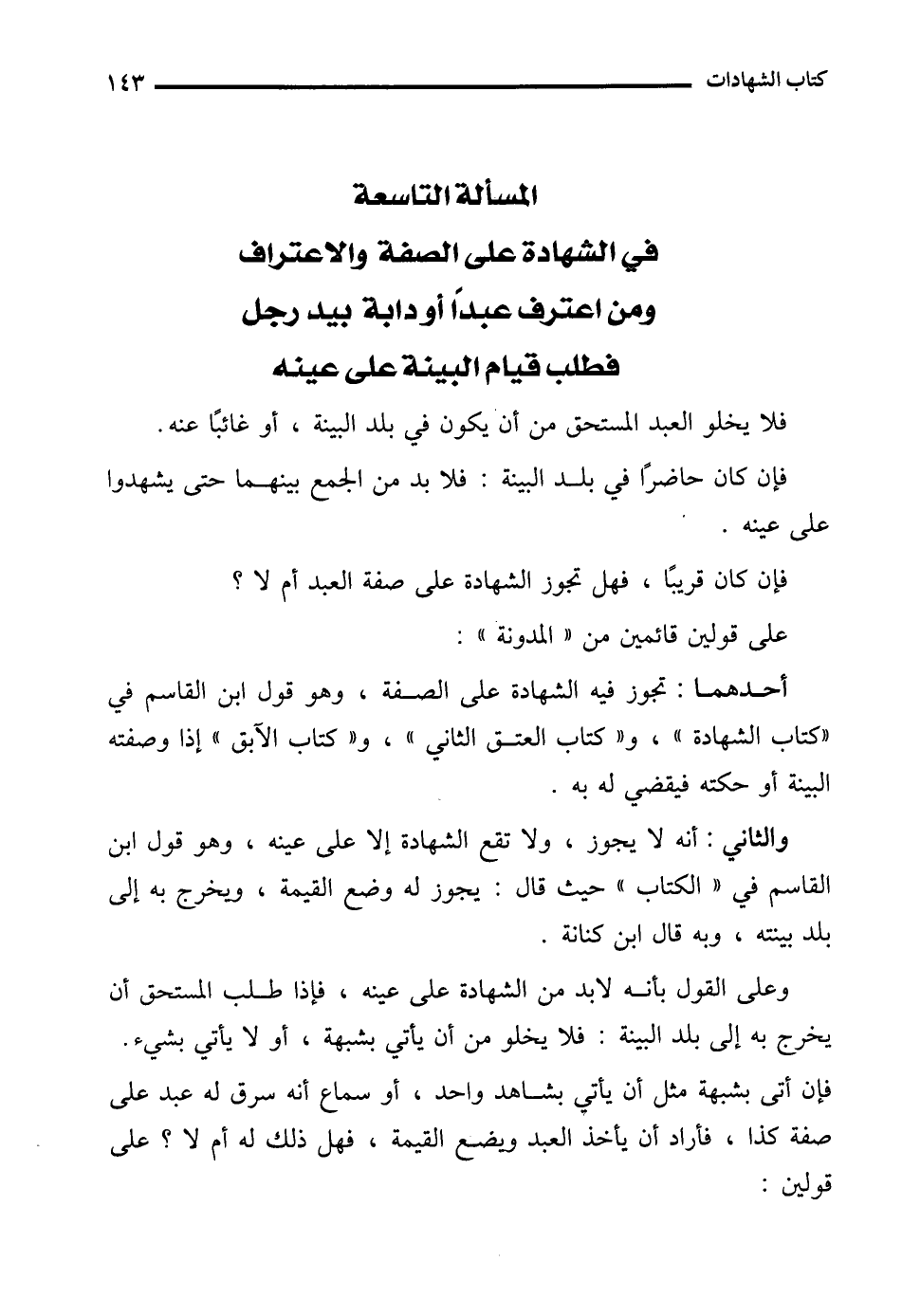 المسألة التاسعة في الشهادة على الصفة والاعتراف ومن اعترف عبدًا أو دابة بيد رجل فطلب قيام البينة على عينه