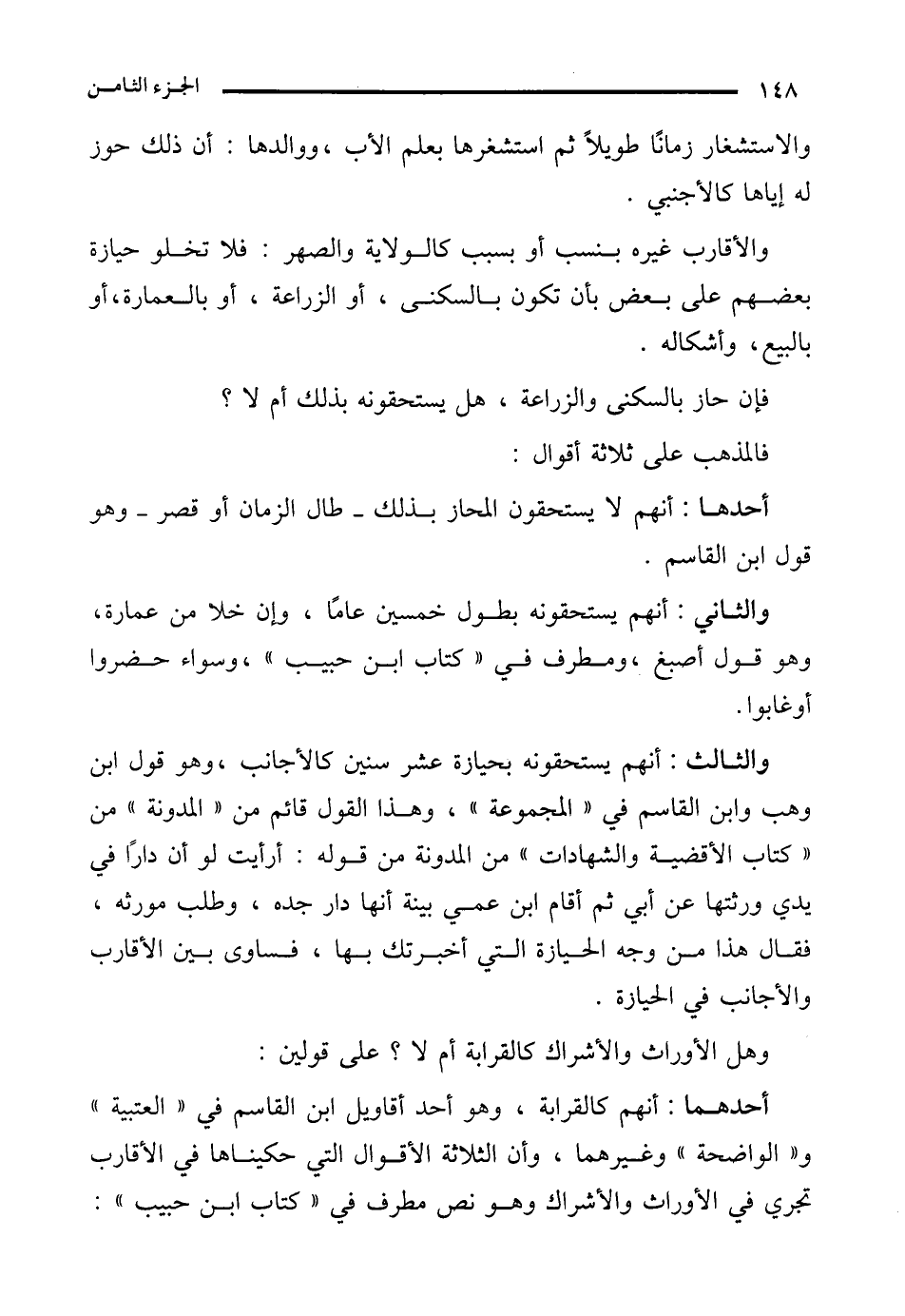 والثالث: أنهم يستحقونه بحيازة عشر سنين كالأجانب، وهو قول ابن وهب وابن القاسم في "المجموعة"، وهذا القول قائم من "المدونة" من "كتاب الأقضية والشهادات" من المدونة من قوله: أرأيت لو أن دارًا في يدي ورثتها عن أبي ثم أقام ابن عمي بينة أنها دار جده، وطلب مورثه، فقال هذا من وجه الحيازة التي أخبرتك بها، فساوى بين الأقارب والأجانب في الحيازة.