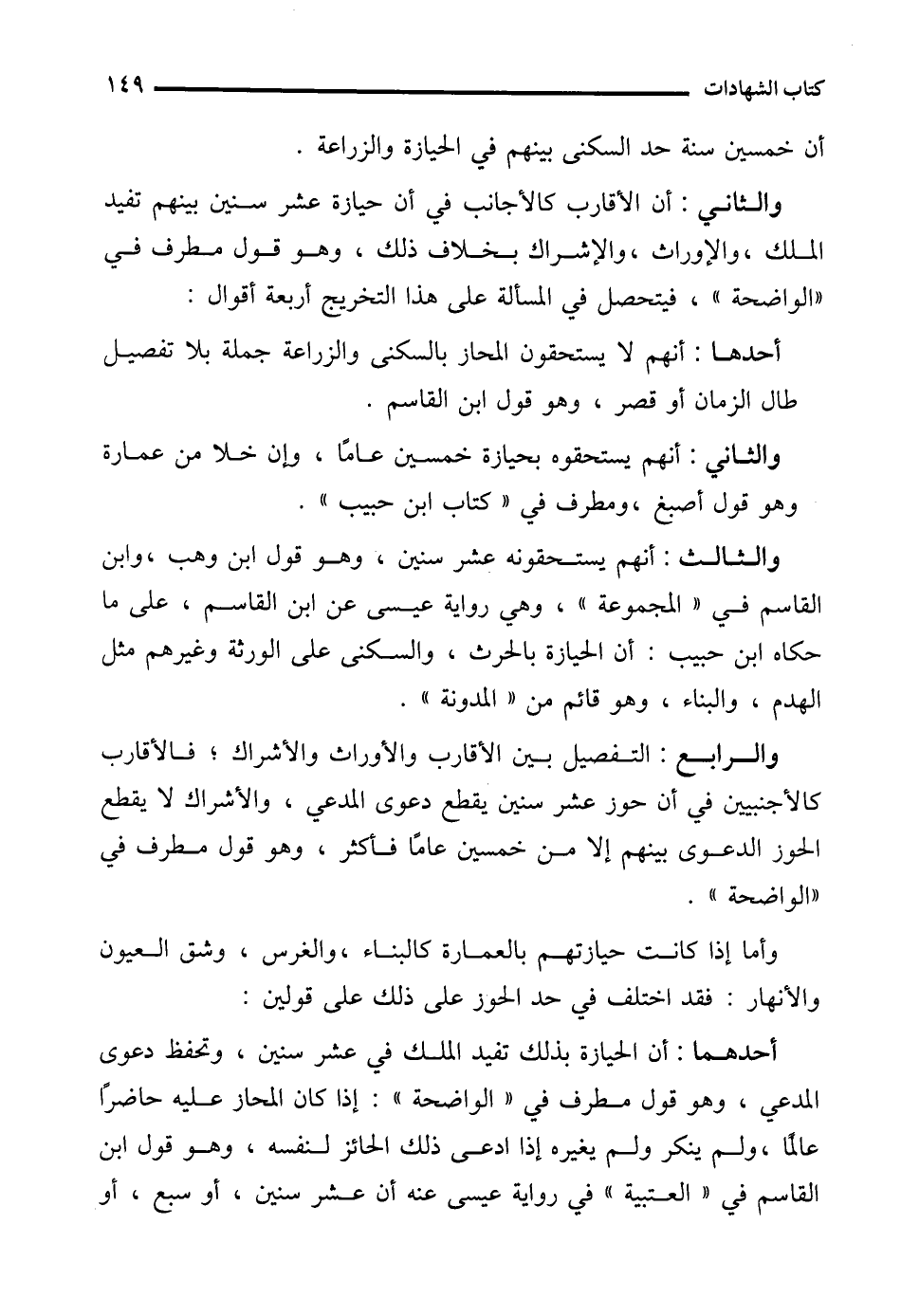 والرابع: التفصيل بين الأقارب والأوراث والأشراك؛ فالأقارب كالأجنبيين في أن حوز عشر سنين يقطع دعوى المدعي، والأشراك لا يقطع الحوز الدعوى بينهم إلا من خمسين عامًا فأكثر، وهو قول مطرف في "الواضحة".