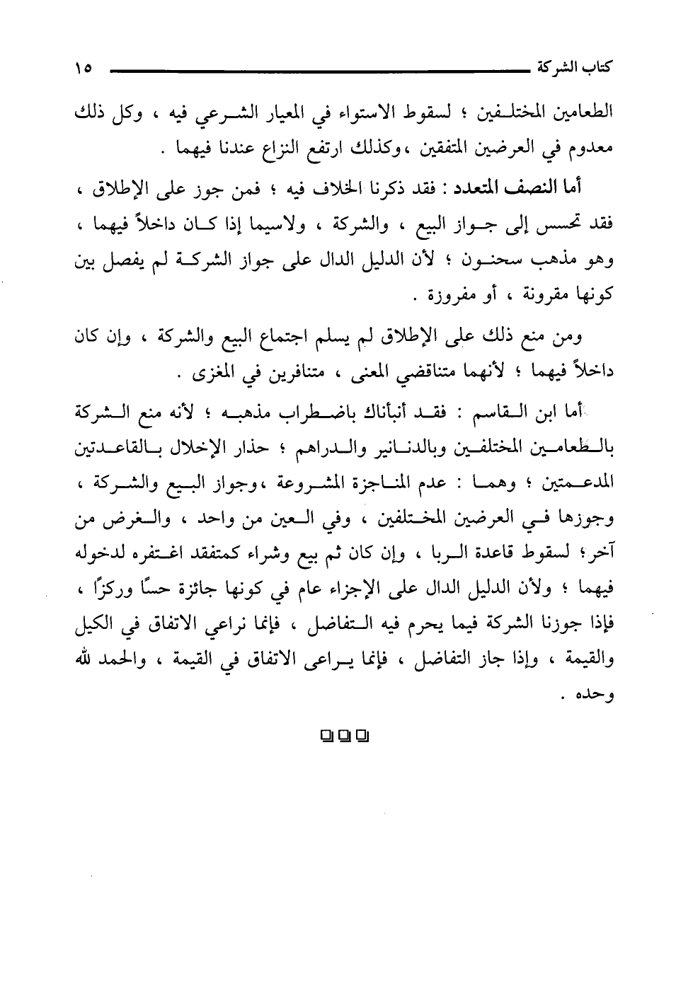 أما ابن القاسم: فقد أنبأناك باضطراب مذهبه؛ لأنه منع الشركة بالطعامين المختلفين وبالدنانير والدراهم؛ حذار الإخلال بالقاعدتين المدعمتين؛ وهما: عدم المناجزة المشروعة، وجواز البيع والشركة، وجوزها في العرضين المختلفين، وفي العين من واحد، والغرض من آخر؛ لسقوط قاعدة الربا، وإن كان ثم بيع وشراء كمتفقد اغتفره لدخوله فيهما؛ ولأن الدليل الدال على الإجزاء عام في كونها جائزة حسًا وركزًا، فإذا جوزنا الشركة فيما يحرم فيه التفاضل، فإنما نراعي الاتفاق في الكيل والقيمة، وإذا جاز التفاضل، فإنما يراعى الاتفاق في القيمة، والحمد لله وحده.