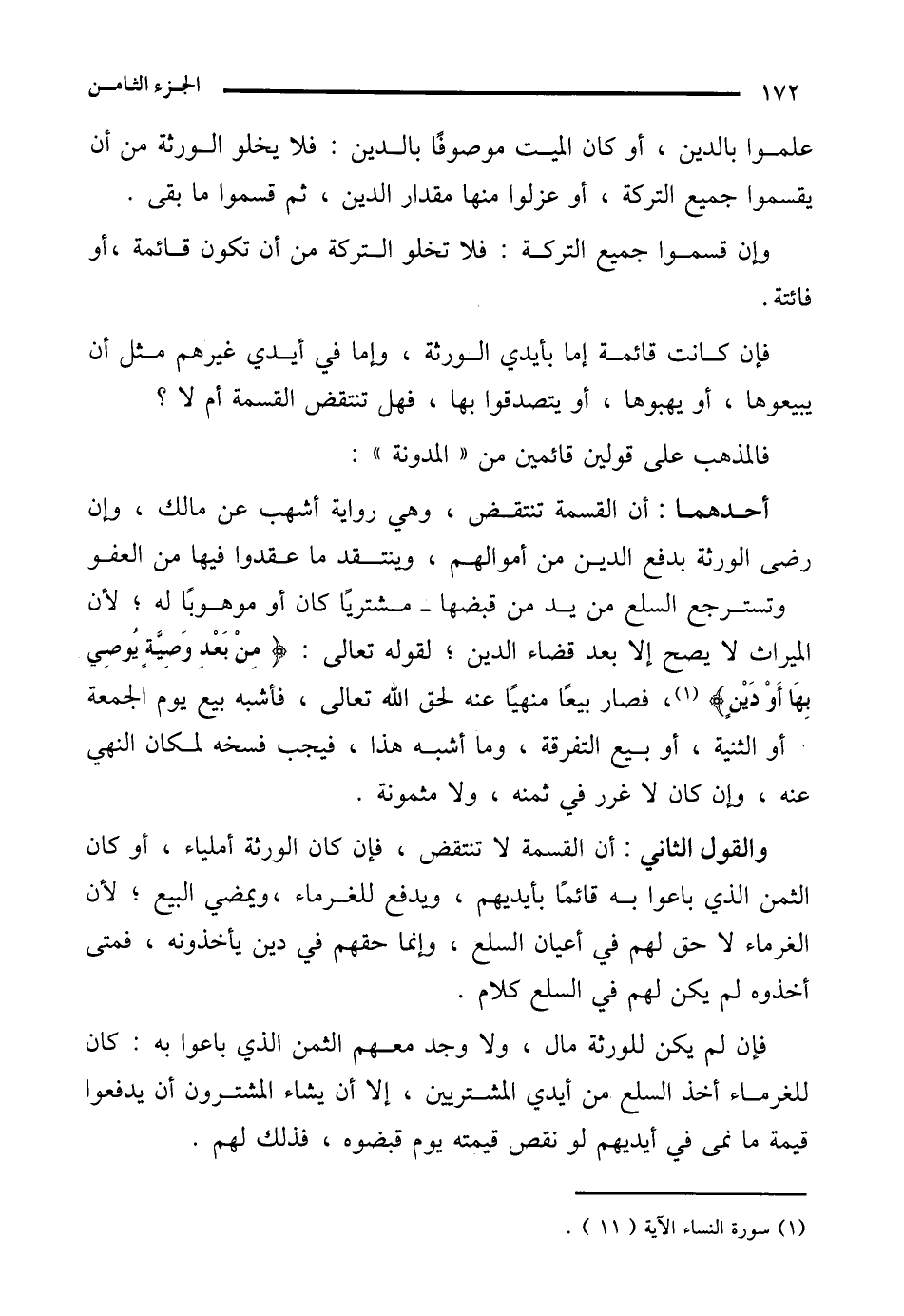 أحدهما: أن القسمة تنتقض، وهي رواية أشهب عن مالك، وإن رضي الورثة بدفع الدين من أموالهم، وينتقد ما عقدوا فيها من العفو وتسترجع السلع من يد من قبضها -مشتريًا كان أو موهوبًا له؛ لأن الميراث لا يصح إلا بعد قضاء الدين؛ لقوله تعالى: {مِنْ بَعْدِ وَصِيَّةٍ يُوصِي بِهَا أَوْ دَيْنٍ} (¬1) , فصار بيعًا منهيًا عنه لحق الله تعالى، فأشبه بيع يوم الجمعة أو الثنية، أو بيع التفرقة، وما أشبه هذا، فيجب فسخه لمكان النهي عنه، وإن كان لا غرر في ثمنه، ولا مثمونة.