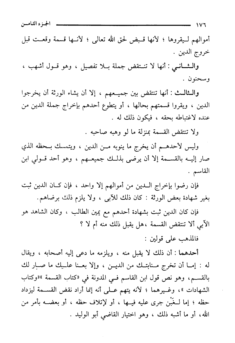 أحدهما: أن ذلك لا يقبل منه، ويلزمه ما دعى إليه أصحابه، ويقال له: إما أن تخرج منابتك من الدين، وإلا بعنا عليك ما صار لك بالقسم، وهو نص قول ابن القاسم في المدونة في "كتاب القسمة" "وكتاب الشهادات"، وغيرهما؛ لأنه يتهم على أنه إنما أراد نقض القسمة ليزداد حظه؛ إما لغَبْن جرى عليه فيها، أو لإتلاف حظه، أو بعضه بأمر من الله، أو ما أشبه ذلك، وهو اختيار القاضي أبو الوليد.