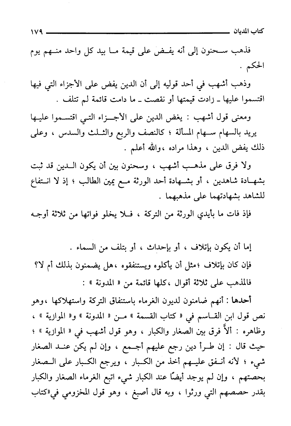 وذهب أشهب في أحد قوليه إلى أن الدين يفض على الأجزاء التي فيها اقتسموا عليها -زادت قيمتها أو نقصت- ما دامت قائمة لم تتلف.