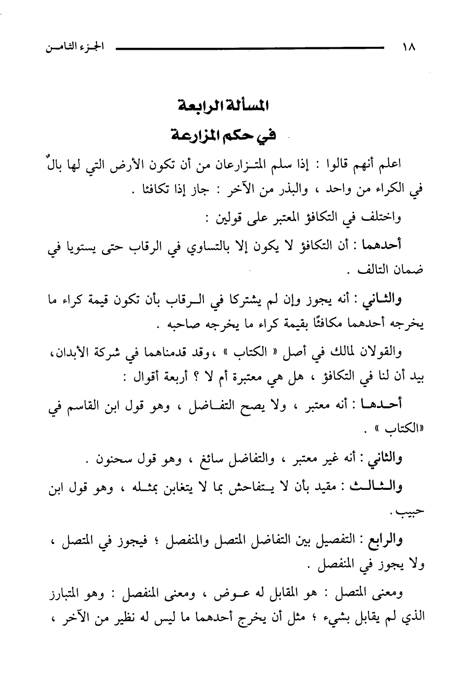 اعلم أنهم قالوا: إذا سلم المتزارعان من أن تكون الأرض التي لها بالٌ في الكراء من واحد، والبذر من الآخر: جاز إذا تكافئا.