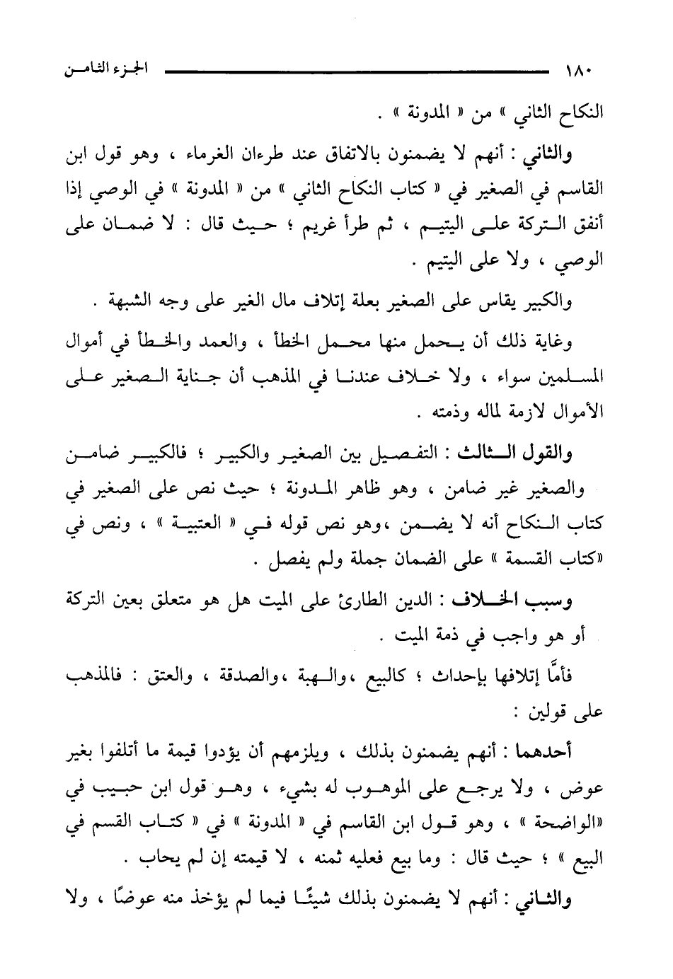 والقول الثالث: التفصيل بين الصغير والكبير؛ فالكبير ضامن والصغير غير ضامن، وهو ظاهر المدونة؛ حيث نص على الصغير في كتاب النكاح أنه لا يضمن، وهو نص قوله في "العتبية"، ونص في "كتاب القسمة" على الضمان جملة ولم يفصل.