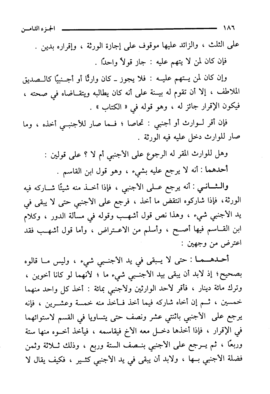 والثاني: أنه يرجع على الأجنبي، فإذا أخذ منه شيئًا شاركه فيه الورثة، فإذا شاركوه انتقض ما أخذ، فرجع على الأجنبي حتى لا يبقى في يد الأجنبي شيء، وهذا نص قول أشهب وقوله في مسألة الدور، وكلام ابن القاسم فيها أصح، وأسلم من الاعتراض، وأما قول أشهب فقد اعترض من وجهين: