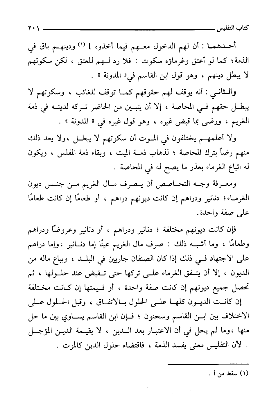 ولا أعلمهم يختلفون في الموت أن سكوتهم لا يبطل، ولا يعد ذلك منهم رضًا بترك المحاصة؛ لذهاب ذمة الميت، وبقاء ذمة المفلس، ويكون له اتباع الغرماء بعذر ما يصح له في المحاصة.
