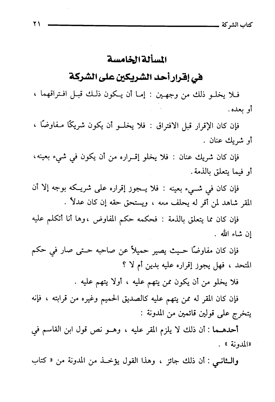 المسألة الخامسة في إقرار أحد الشريكين على الشركة