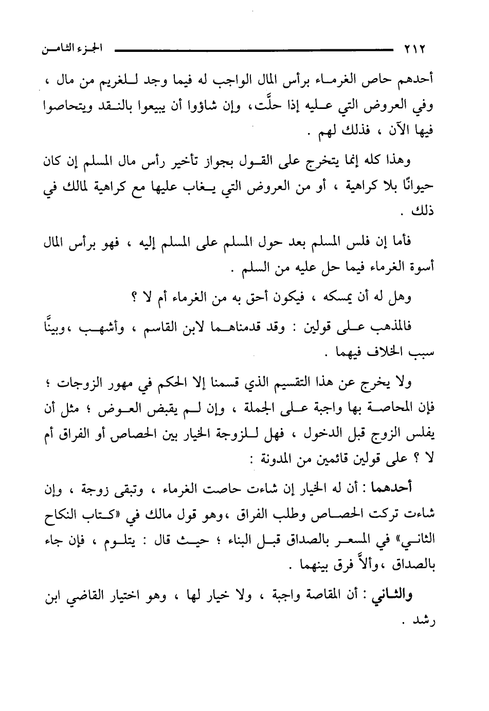 ولا يخرج عن هذا التقسيم الذي قسمنا إلا الحكم في مهور الزوجات؛ فإن المحاصة بها واجبة على الجملة، وإن لم يقبض العوض؛ مثل أن يفلس الزوج قبل الدخول، فهل للزوجة الخيار بين الحصاص أو الفراق أم لا؟ على قولين قائمين من المدونة: