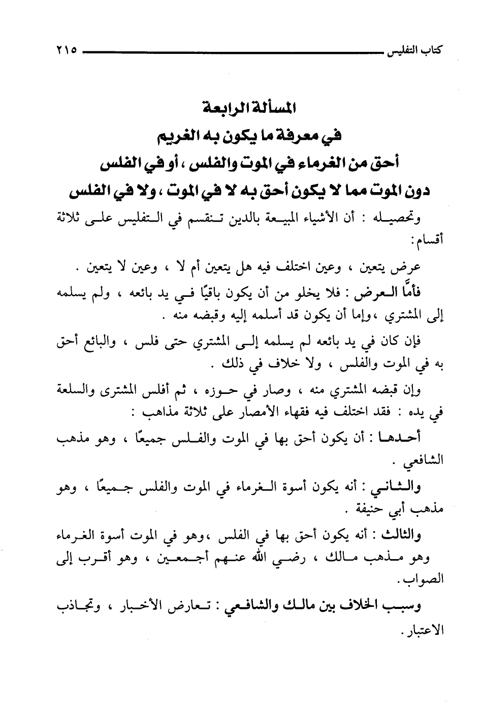 المسألة الرابعة في معرفة ما يكون به الغريم أحق من الغرماء في الموت والفلس، أو في الفلس دون الموت مما لا يكون أحق به لا في الموت، ولا في الفلس