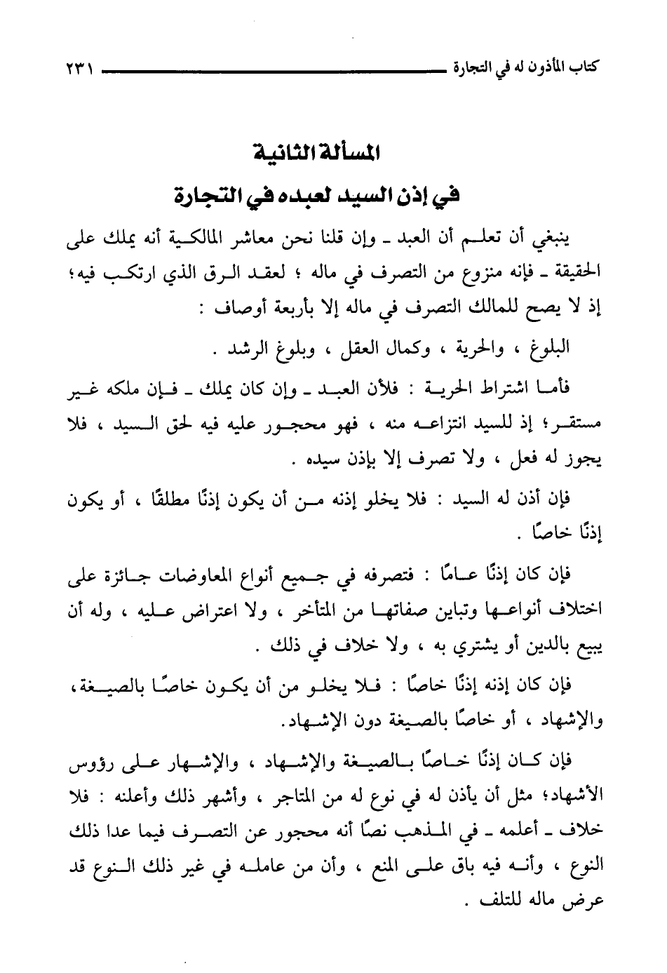 المسألة الثانية في إذن السيد لعبده في التجارة