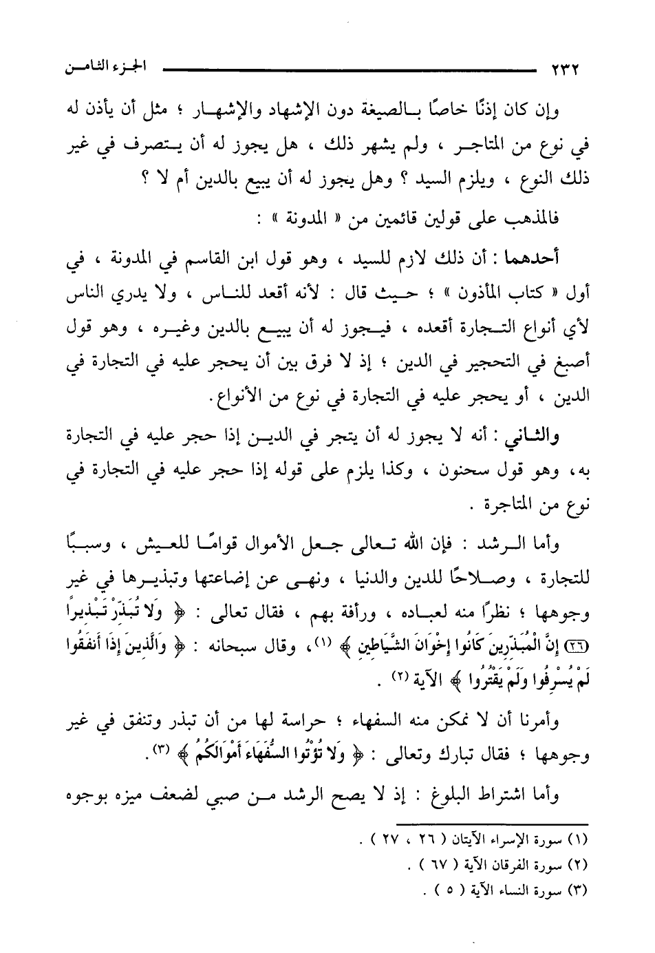 وأما الرشد: فإن الله تعالى جعل الأموال قوامًا للعيش، وسببًا للتجارة، وصلاحًا للدين والدنيا، ونهى عن إضاعتها وتبذيرها في غير وجوهها؛ نظرًا منه لعباده، ورأفة بهم، فقال تعالى: {وَلَا تُبَذِّرْ تَبْذِيرًا (26) إِنَّ الْمُبَذِّرِينَ كَانُوا إِخْوَانَ الشَّيَاطِينِ} (¬1)، وقال سبحانه: {وَالَّذِينَ إِذَا أَنْفَقُوا لَمْ يُسْرِفُوا وَلَمْ يَقْتُرُوا} الآية (¬2).