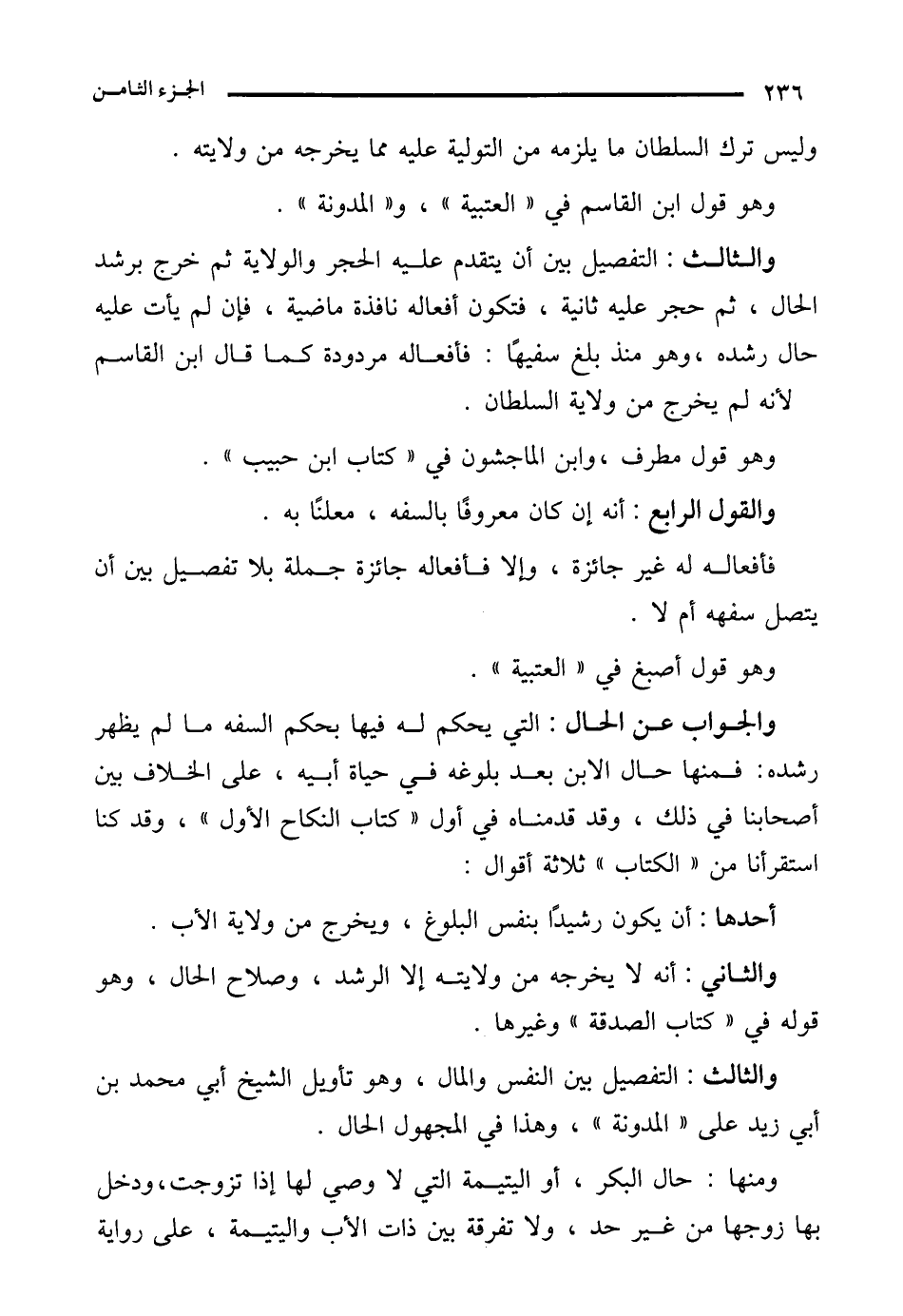 والثالث: التفصيل بين أن يتقدم عليه الحجر والولاية ثم خرج برشد الحال، ثم حجر عليه ثانية، فتكون أفعاله نافذة ماضية، فإن لم يأت عليه حال رشده، وهو منذ بلغ سفيهًا: فأفعاله مردودة كما قال ابن القاسم لأنه لم يخرج من ولاية السلطان.
