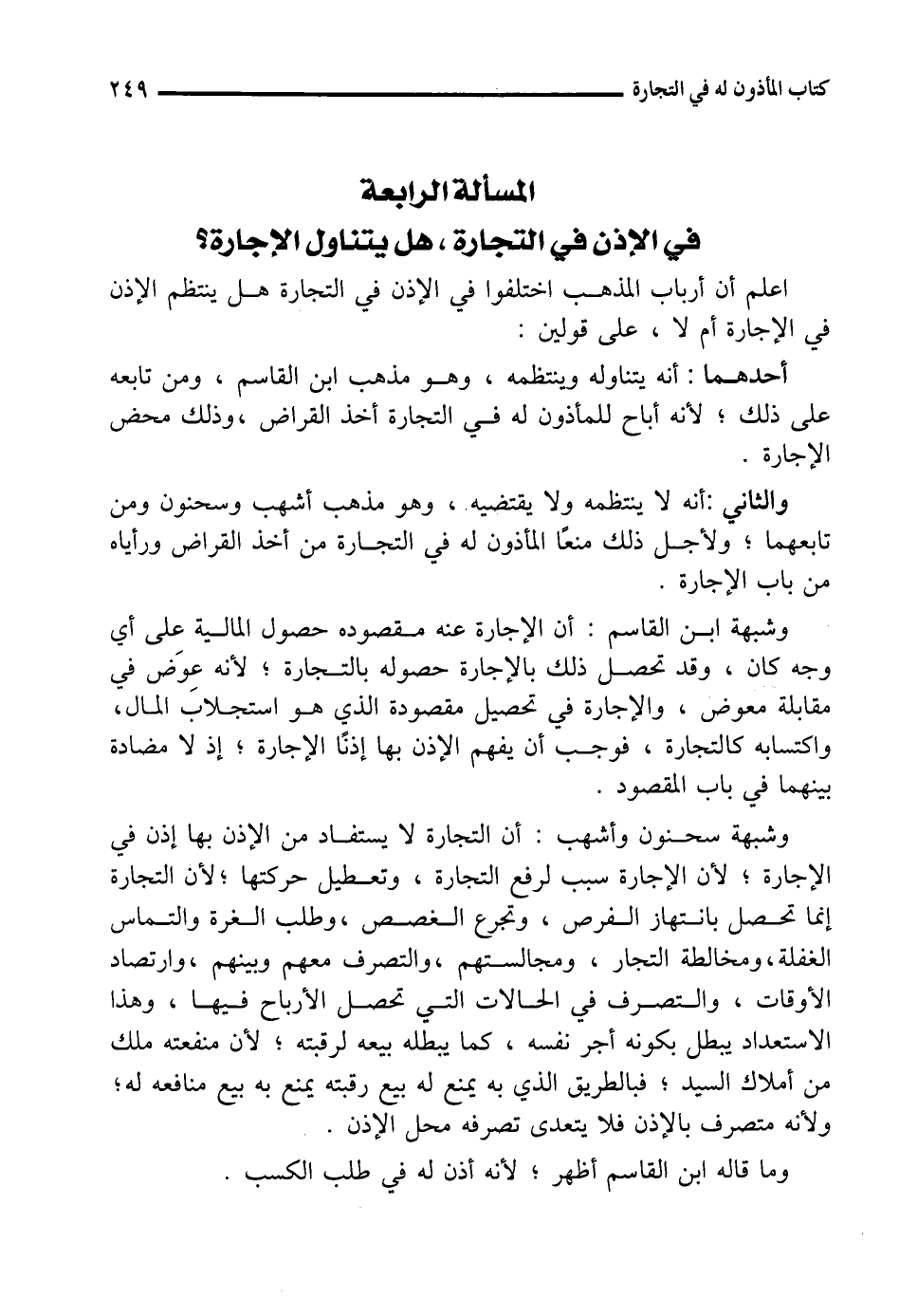 المسألة الرابعة في الإذن في التجارة، هل يتناول الإجارة؟