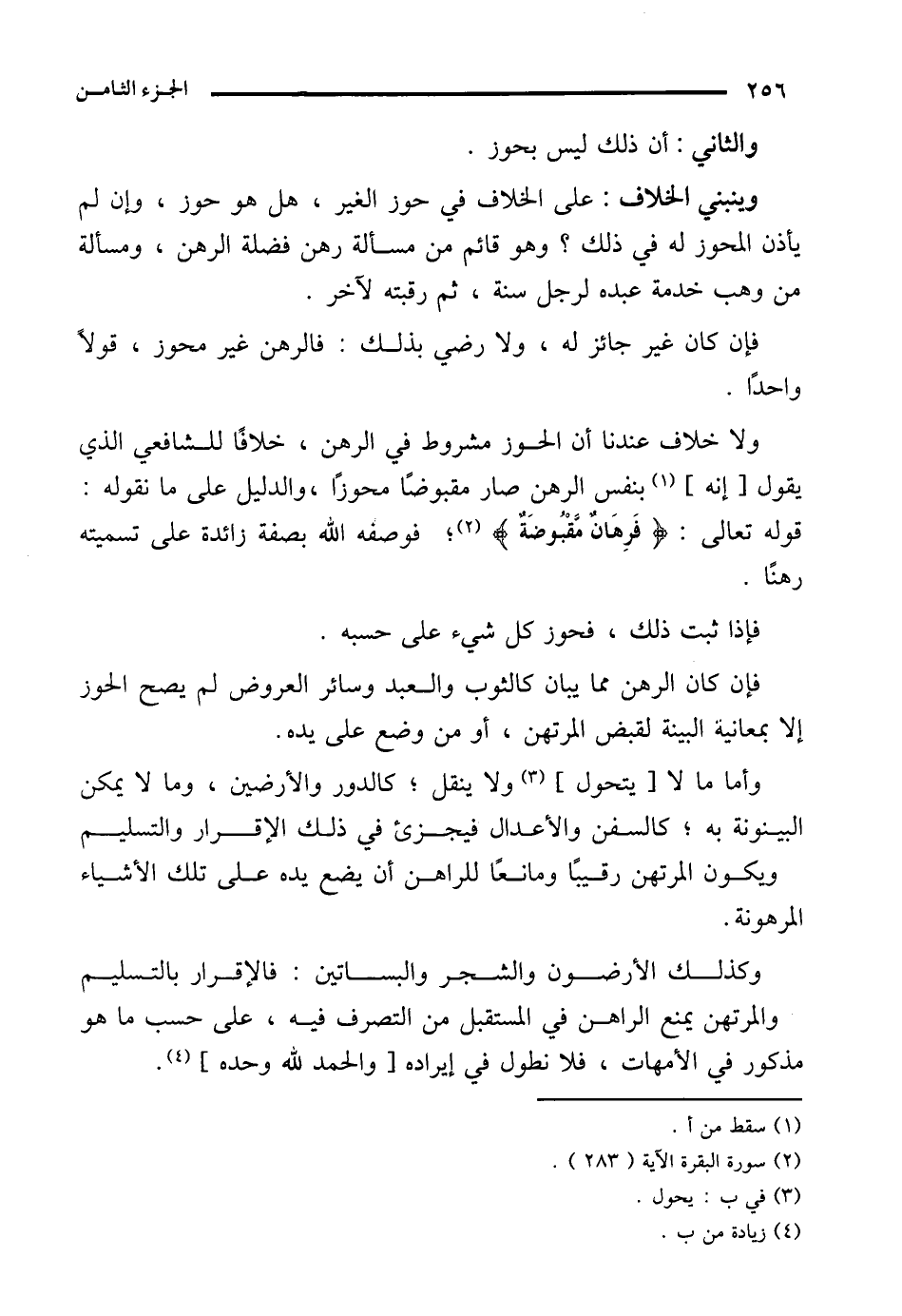 ولا خلاف عندنا أن الحوز مشروط في الرهن، خلافًا للشافعي الذي يقول [إنه] (¬1) بنفس الرهن صار مقبوضًا محوزًا، والدليل على ما نقوله: قوله تعالى: {فَرِهَانٌ مَقْبُوضَةٌ} (¬2)؛ فوصفه الله بصفة زائدة على تسميته رهنًا.