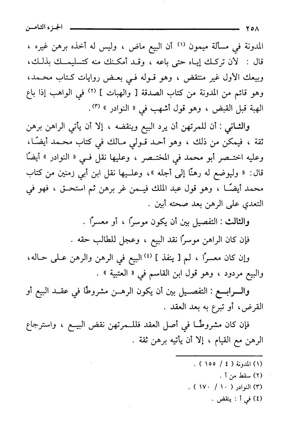 والرابع: التفصيل بين أن يكون الرهن مشروطًا في عقد البيع أو القرض، أو تبرع به بعد العقد.