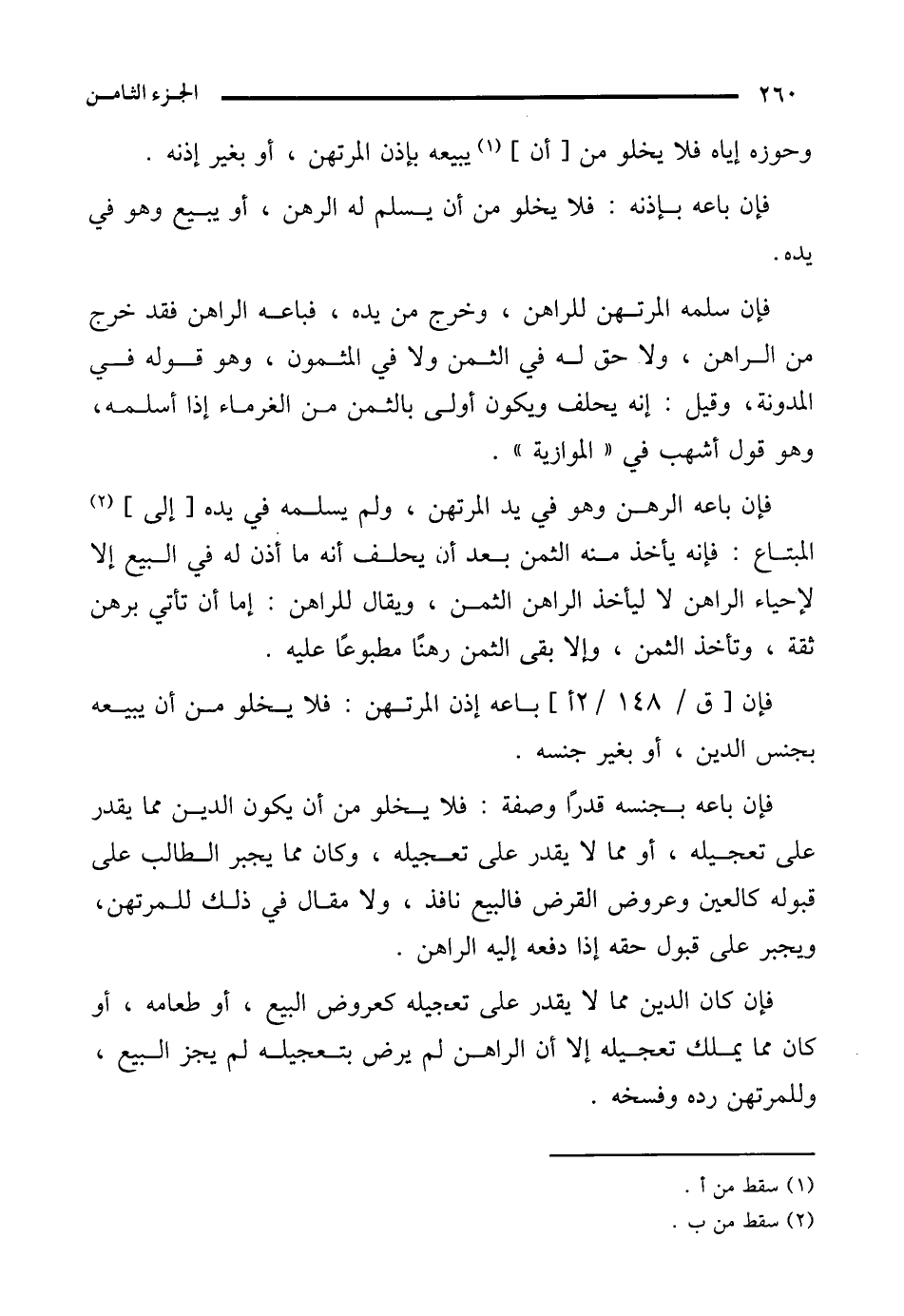 فإن باعه الرهن وهو في يد المرتهن، ولم يسلمه في يده [إلى] (¬2) المبتاع: فإنه يأخذ منه الثمن بعد أن يحلف أنه ما أذن له في البيع إلا لإحياء الراهن لا ليأخذ الراهن الثمن، ويقال للراهن: إما أن تأتي برهن ثقة، وتأخذ الثمن، وإلا بقى الثمن رهنًا مطبوعًا عليه.