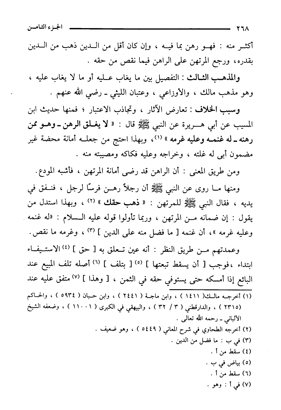 ومنها ما روى عن النبي - صلى الله عليه وسلم - أن رجلًا رهن فرسًا لرجل، فنفق في يديه، فقال النبي - صلى الله عليه وسلم - للمرتهن: "ذهب حقك" (¬2)، وبهذا استدل من يقول: إن ضمانه من المرتهن، وربما تأولوا قوله عليه السلام: "له غنمه وعليه غرمه"، أن غنمه [ما فضل منه على الدين] (¬3)، وغرمه ما نقص.