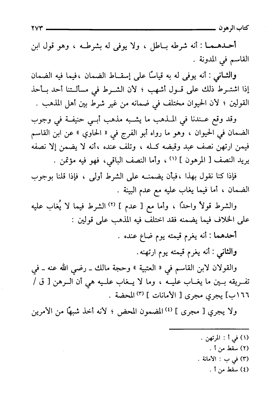 والقولان لابن القاسم في "العتبية" وحجة مالك - رضي الله عنه - في تفريقه بين ما يغاب عليه، وما لا يغاب عليه هي أن الرهن يجري مجرى [الأمانات] (¬3) المحضة.