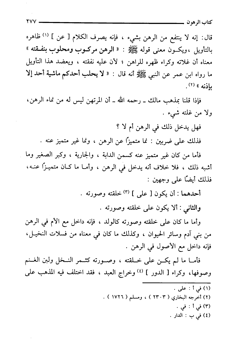 وأما ما كان على خلقته وصورته كالولد، فإنه داخل مع الأم في الرهن من بني آدم وسائر الحيوان، وكذلك ما كان في معناه من فسلات النخيل، فإنه داخل مع الأصول في الرهن.